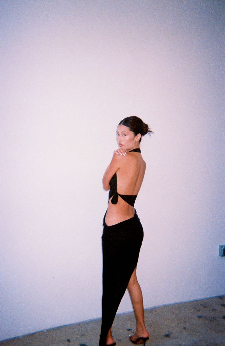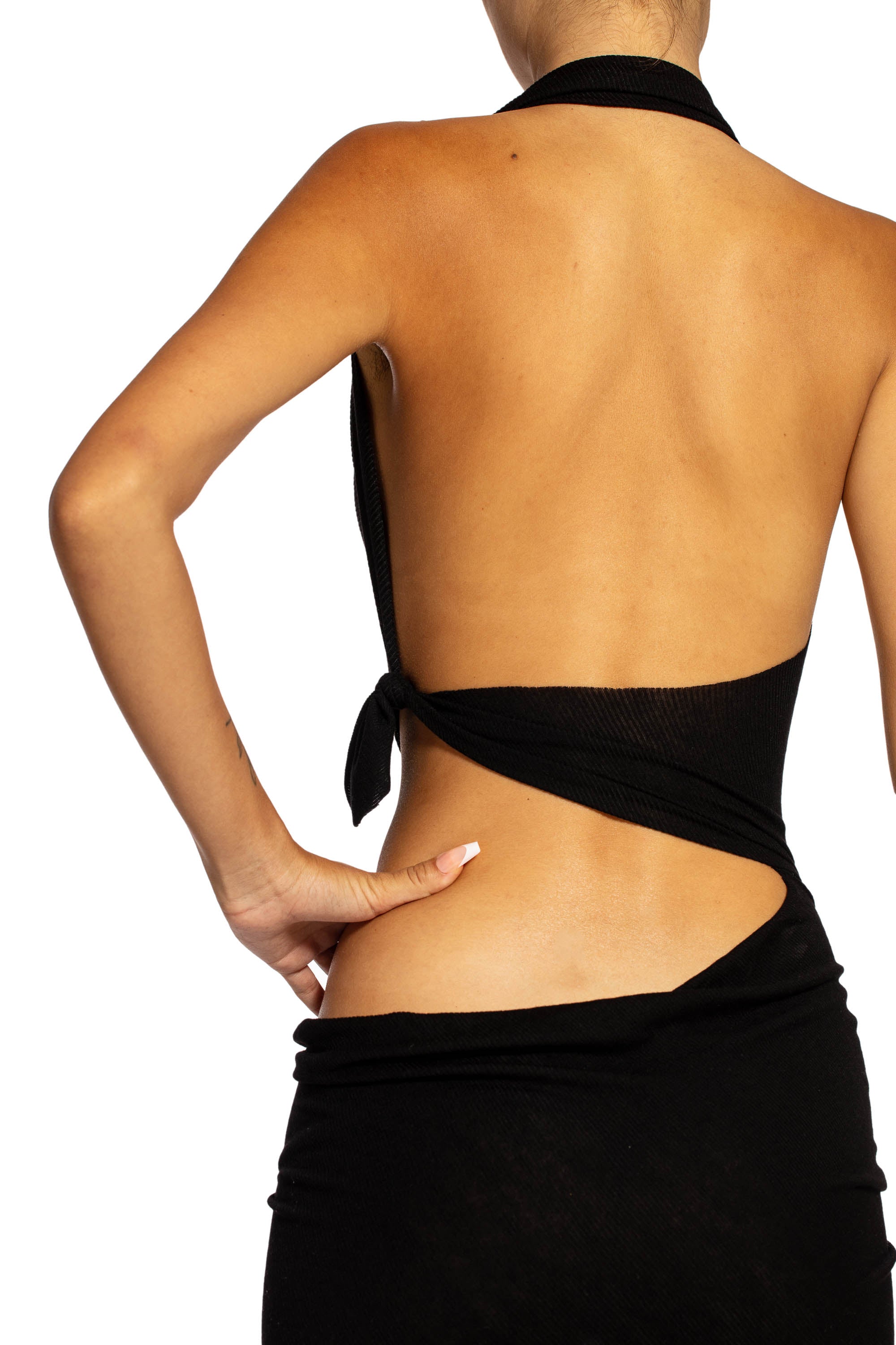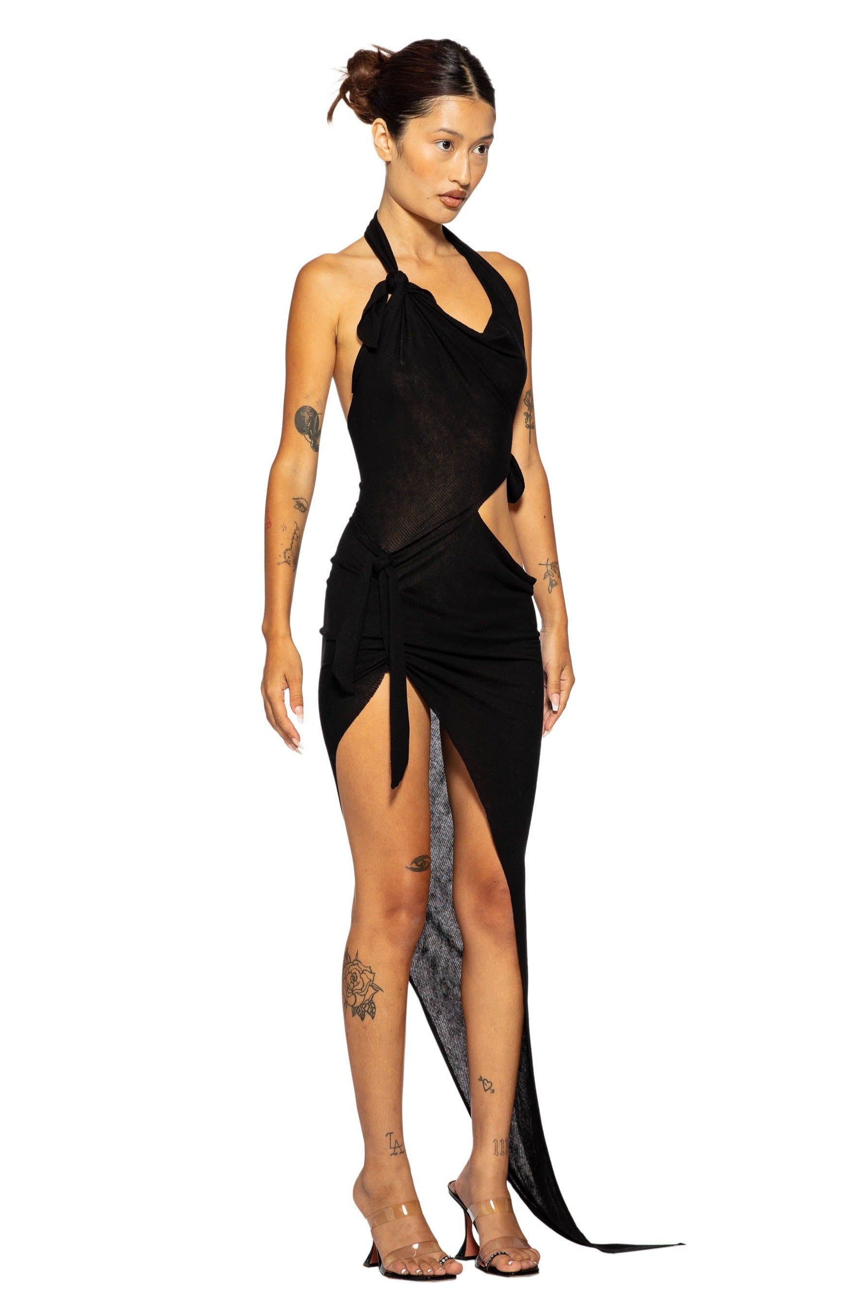 TIED UP ASYMMETRIC CUTOUT DRESS IN BLACK RIB