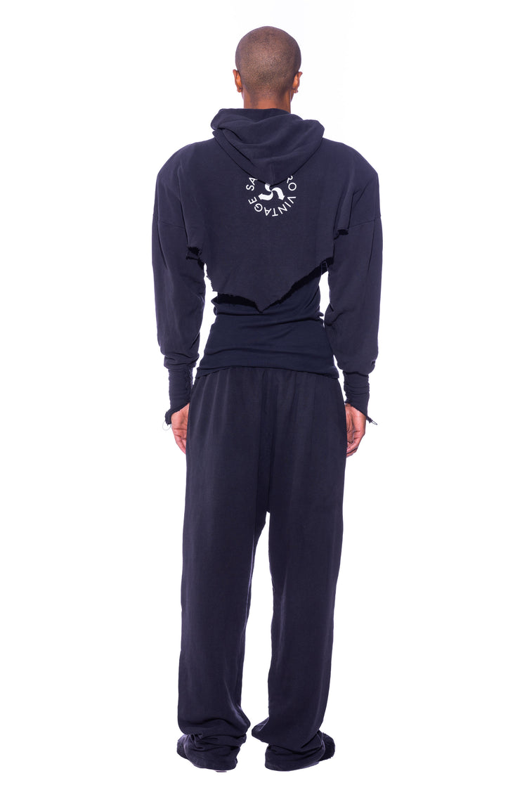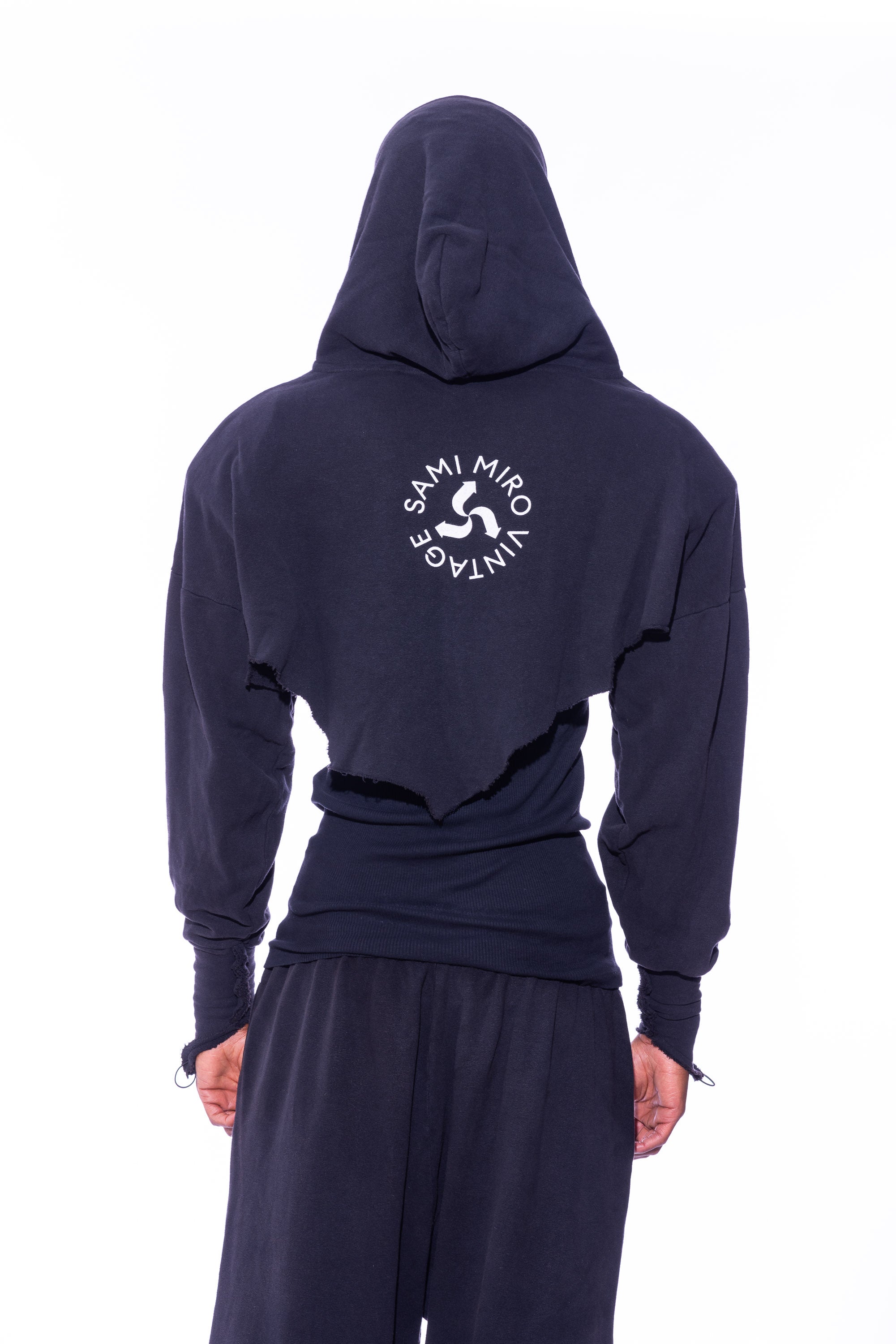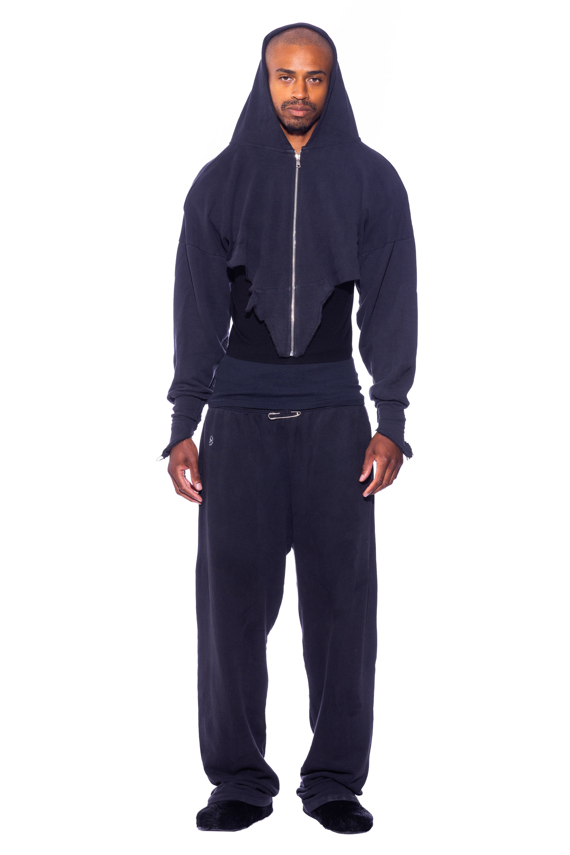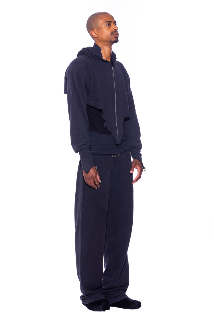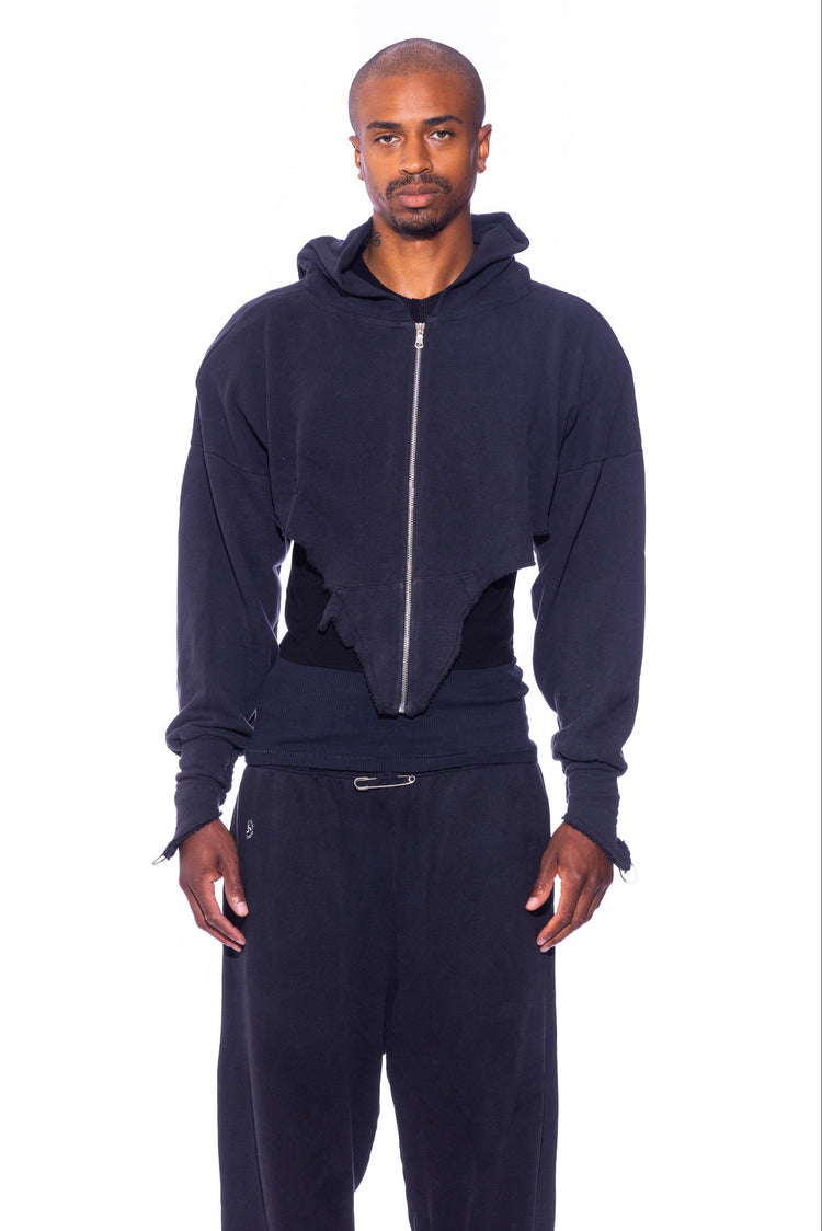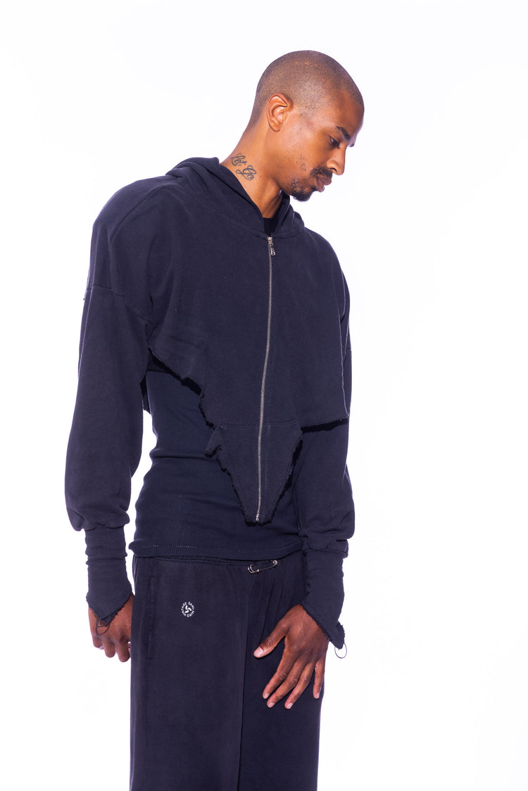 V CUT ZIP-UP HOODIE IN BLACK TERRY