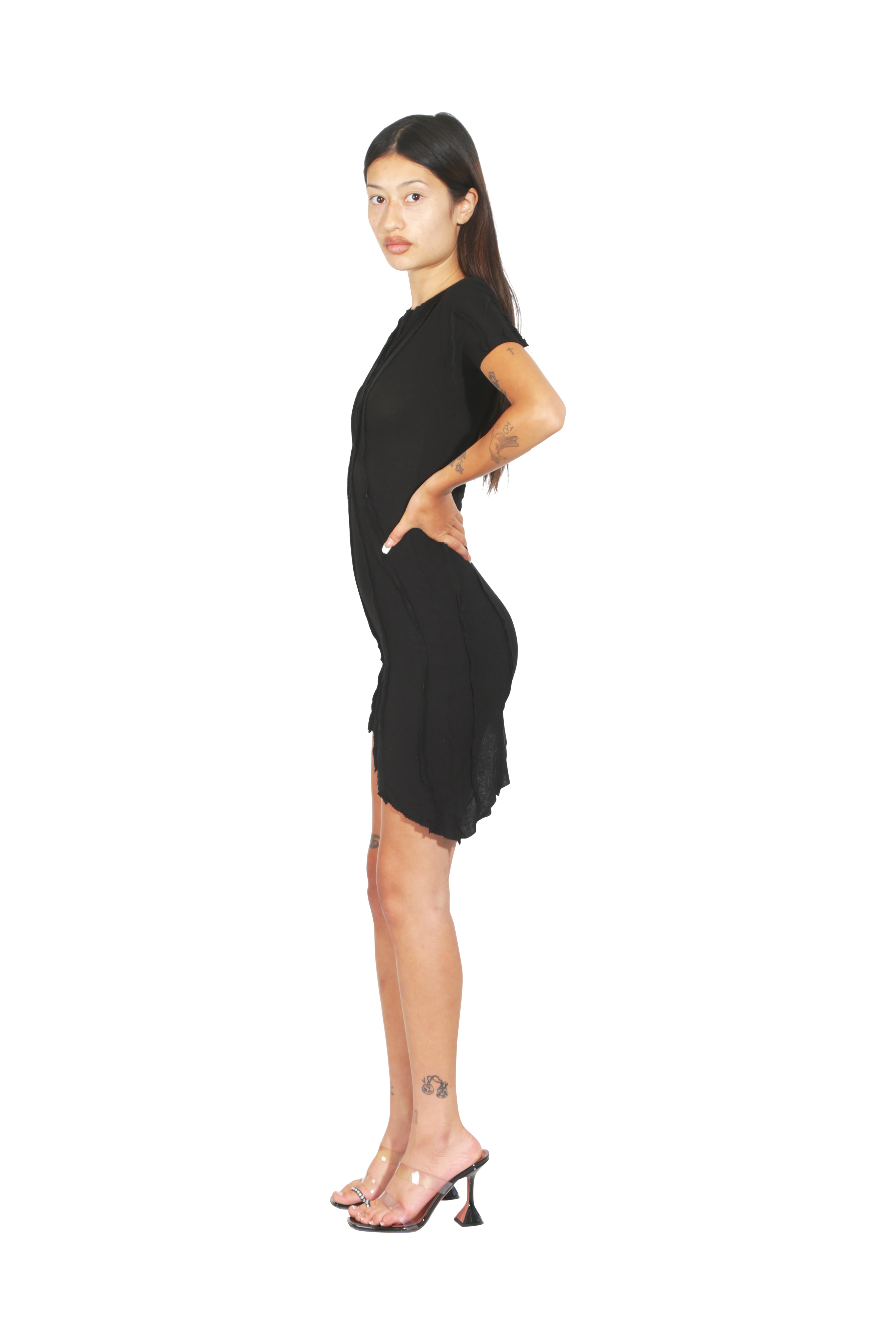 ASYMMETRIC SHORT SLEEVE MINI DRESS IN BLACK RIB