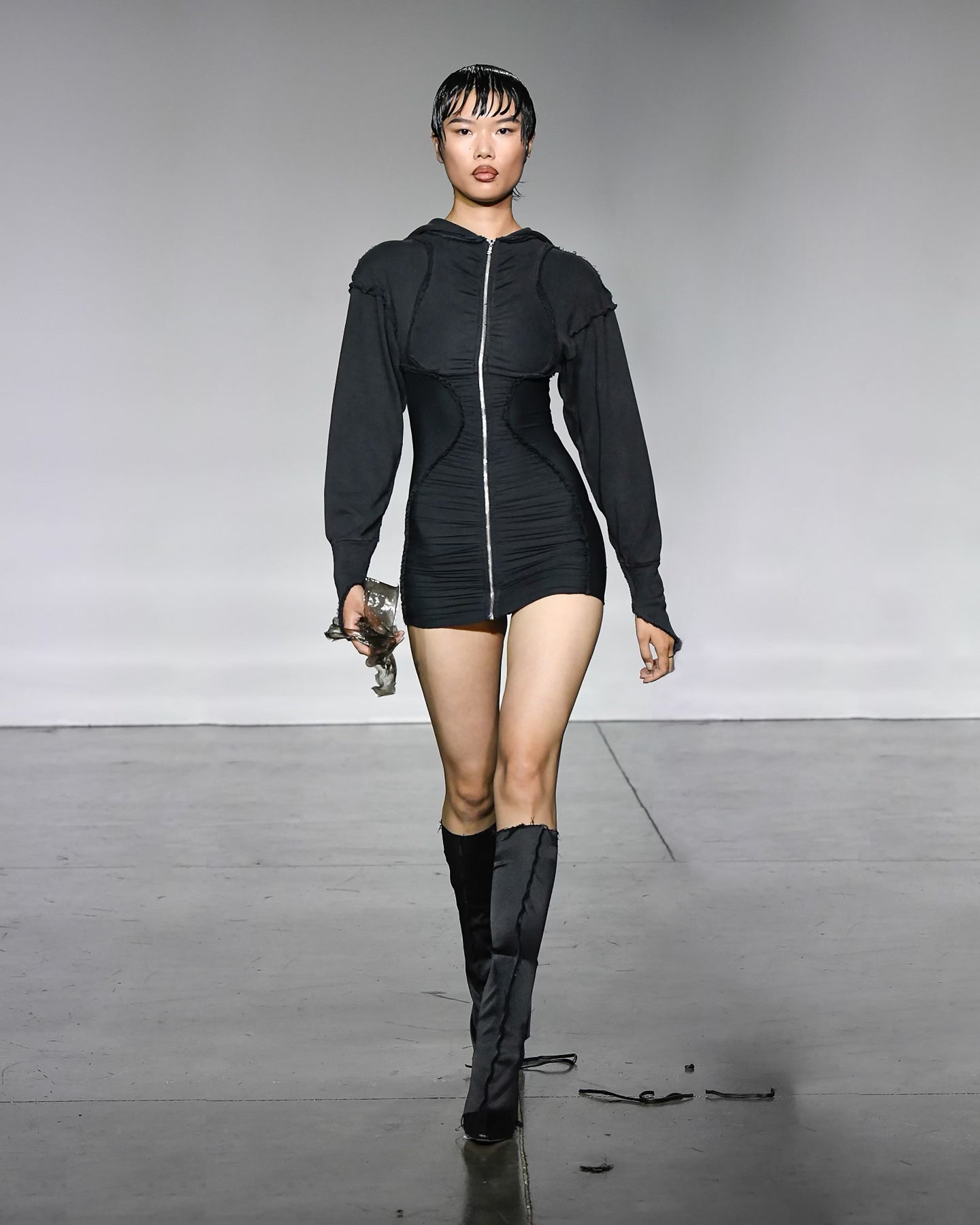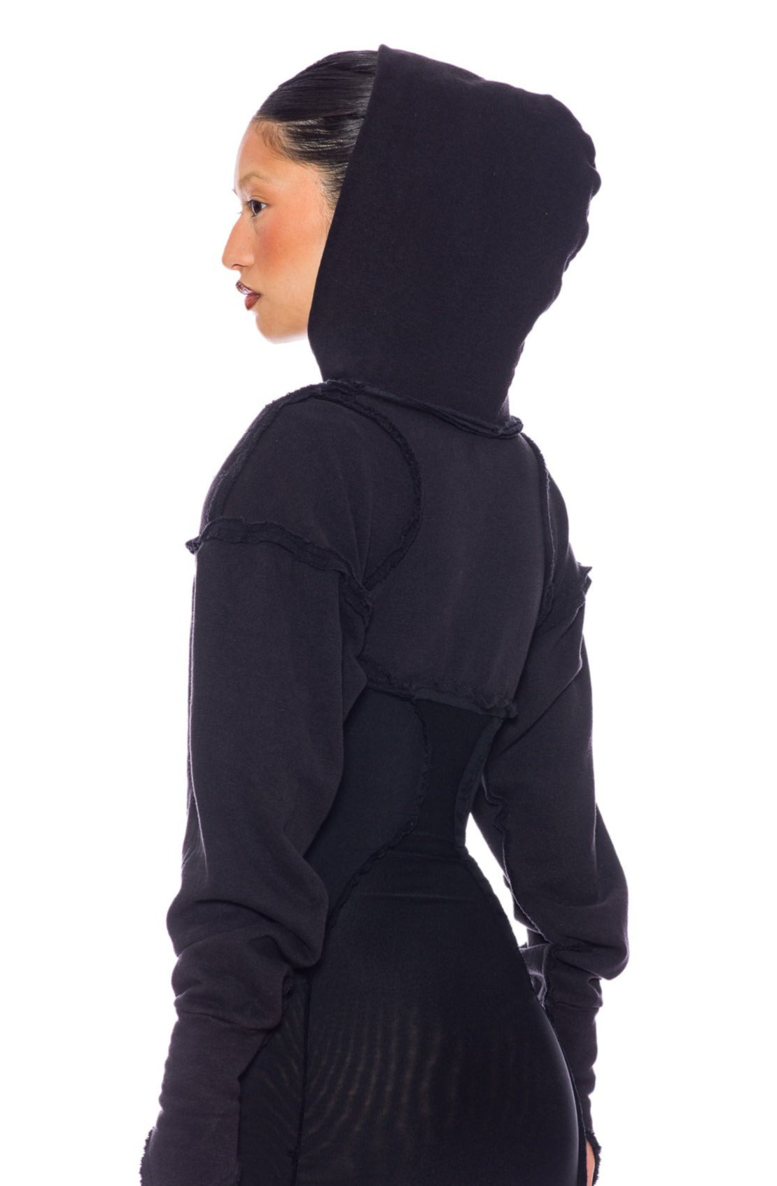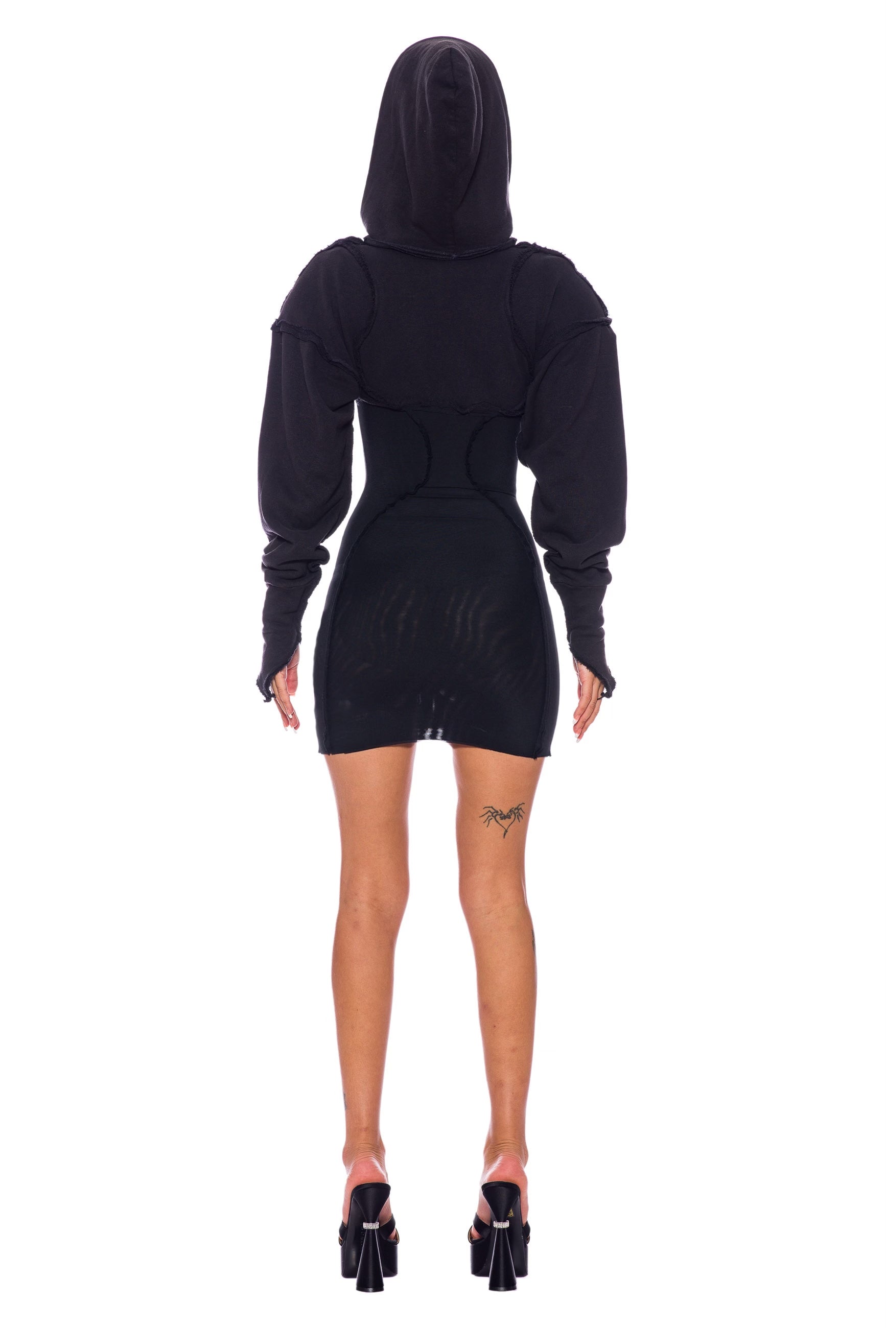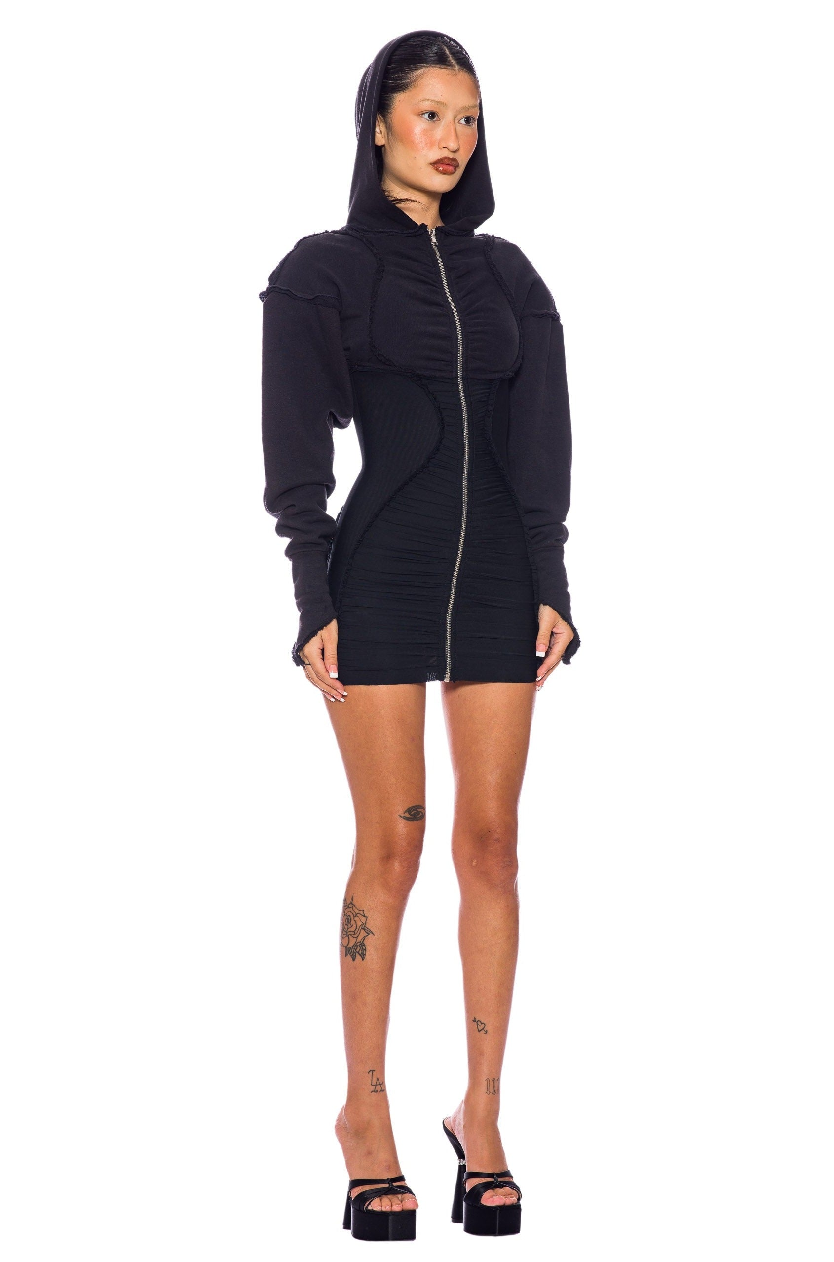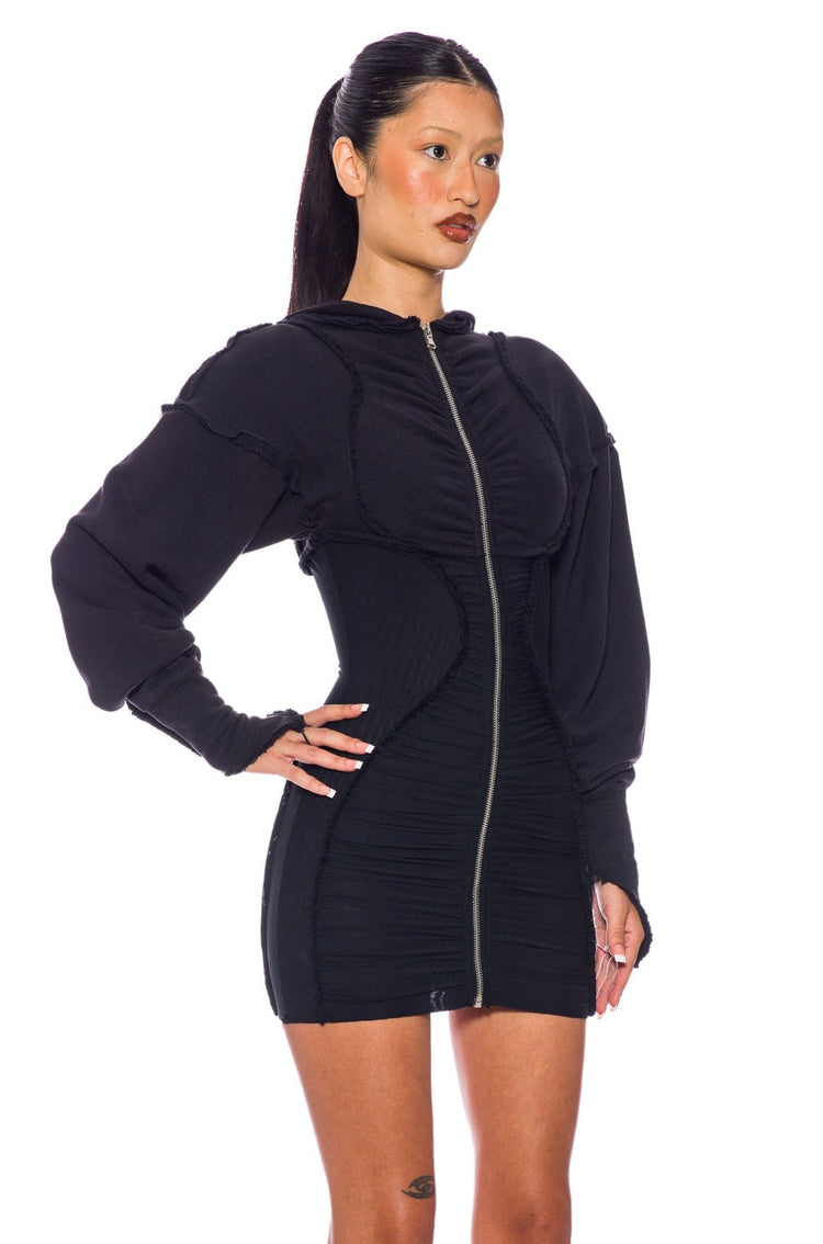 OPEN SEAM ZIP HOODIE DRESS IN BLACK