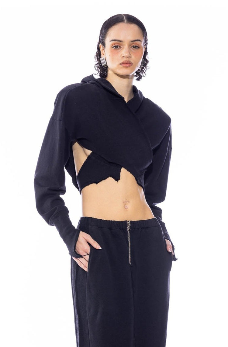 Raw hem with victorian cuffs, finger elastic, hood and removable shoulder pads.
