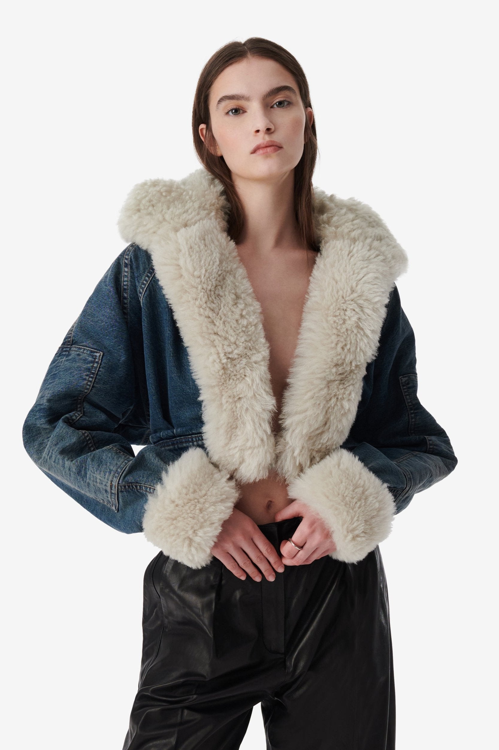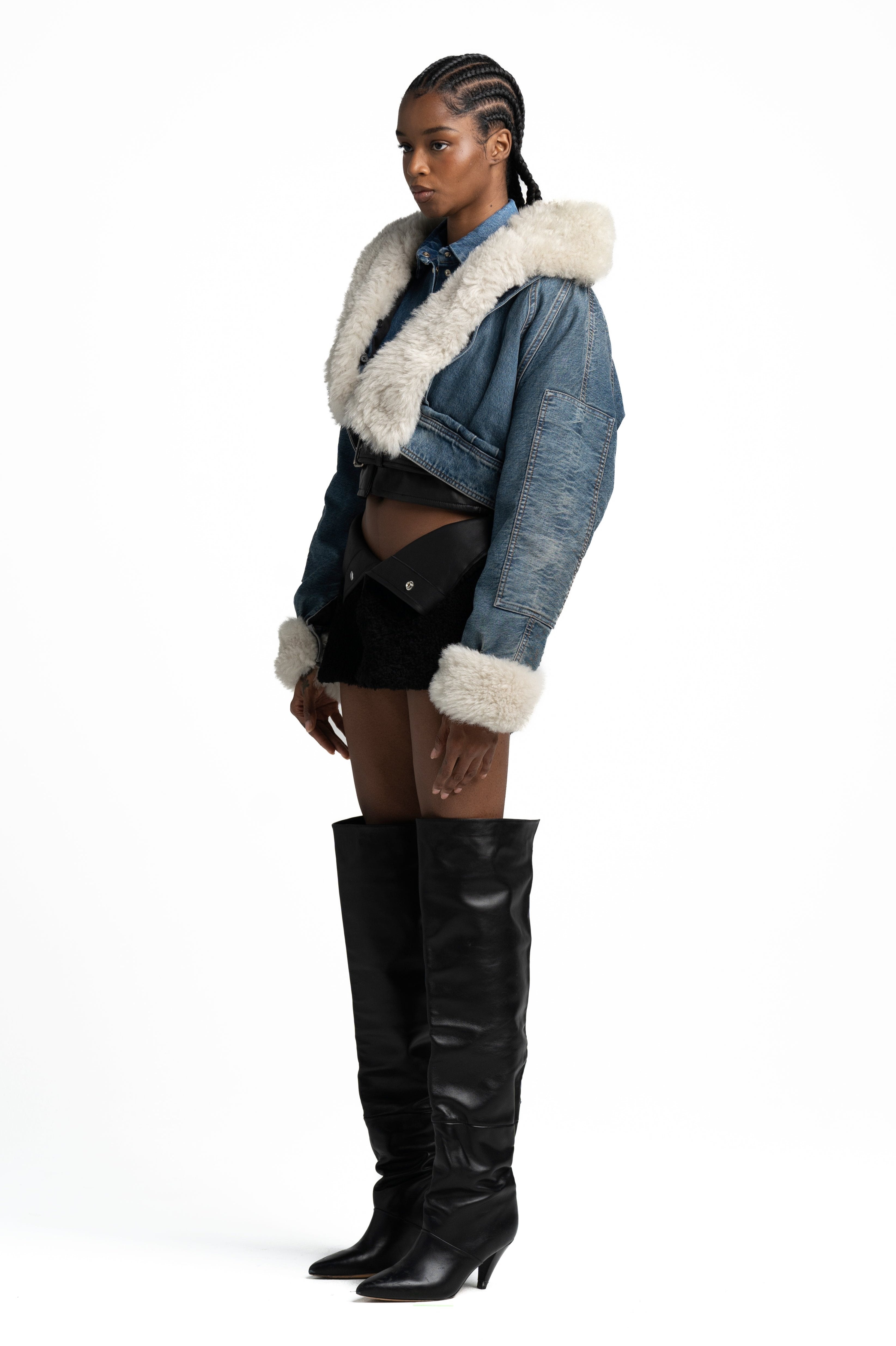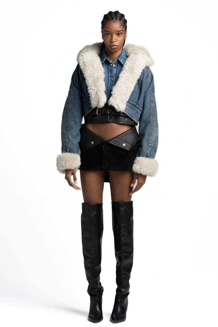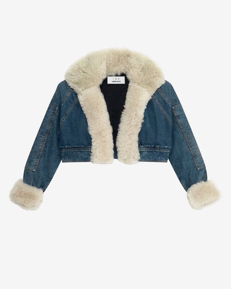 Repurposed and cropped from IRO's shearling denim jacket. Original shearling collar is reworked as sleeve cuffs.