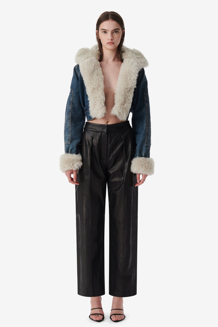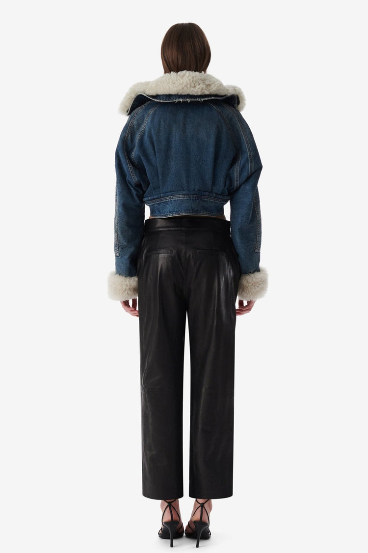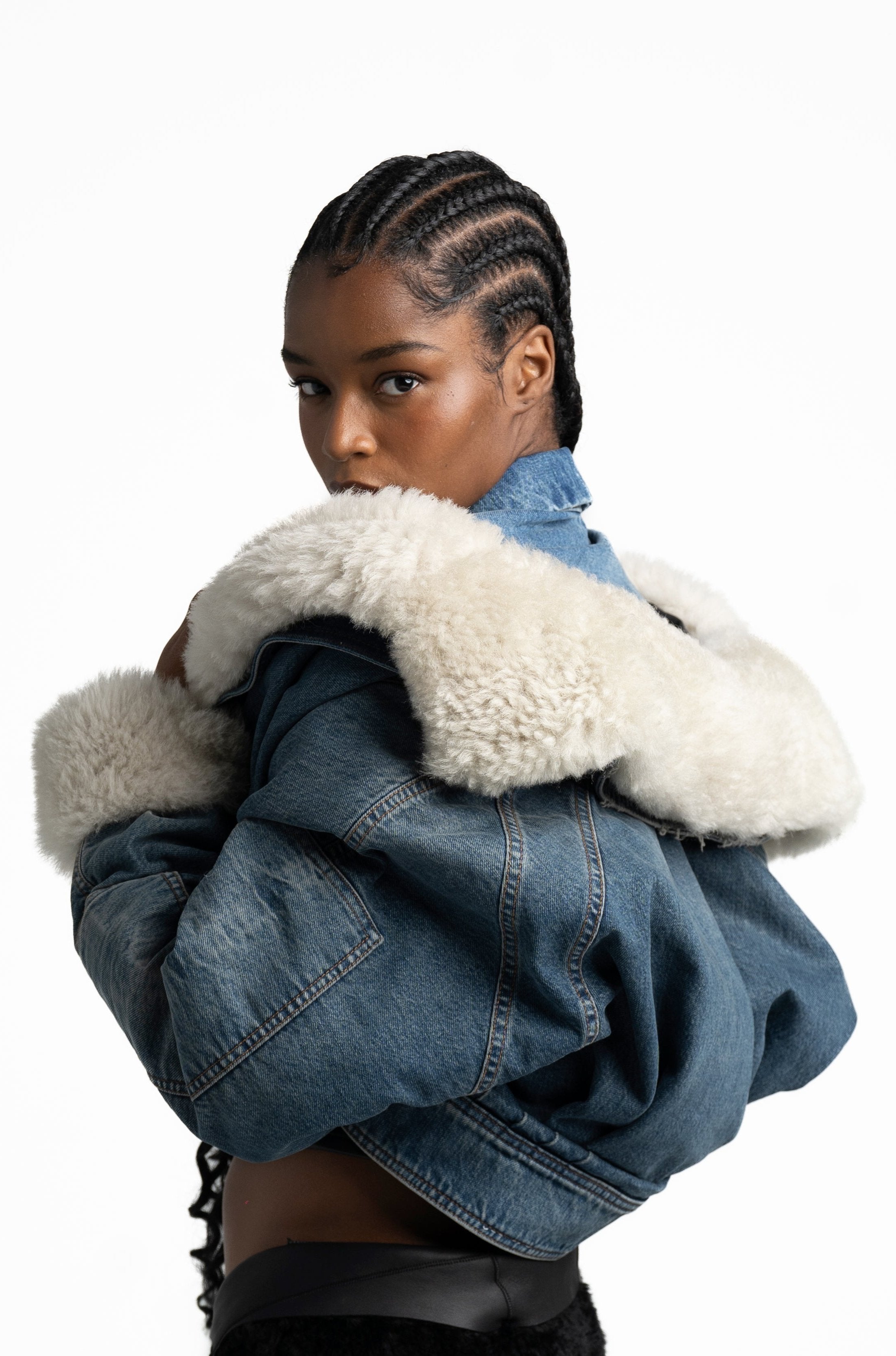 Repurposed and cropped from IRO's shearling denim jacket. Original shearling collar is reworked as sleeve cuffs.