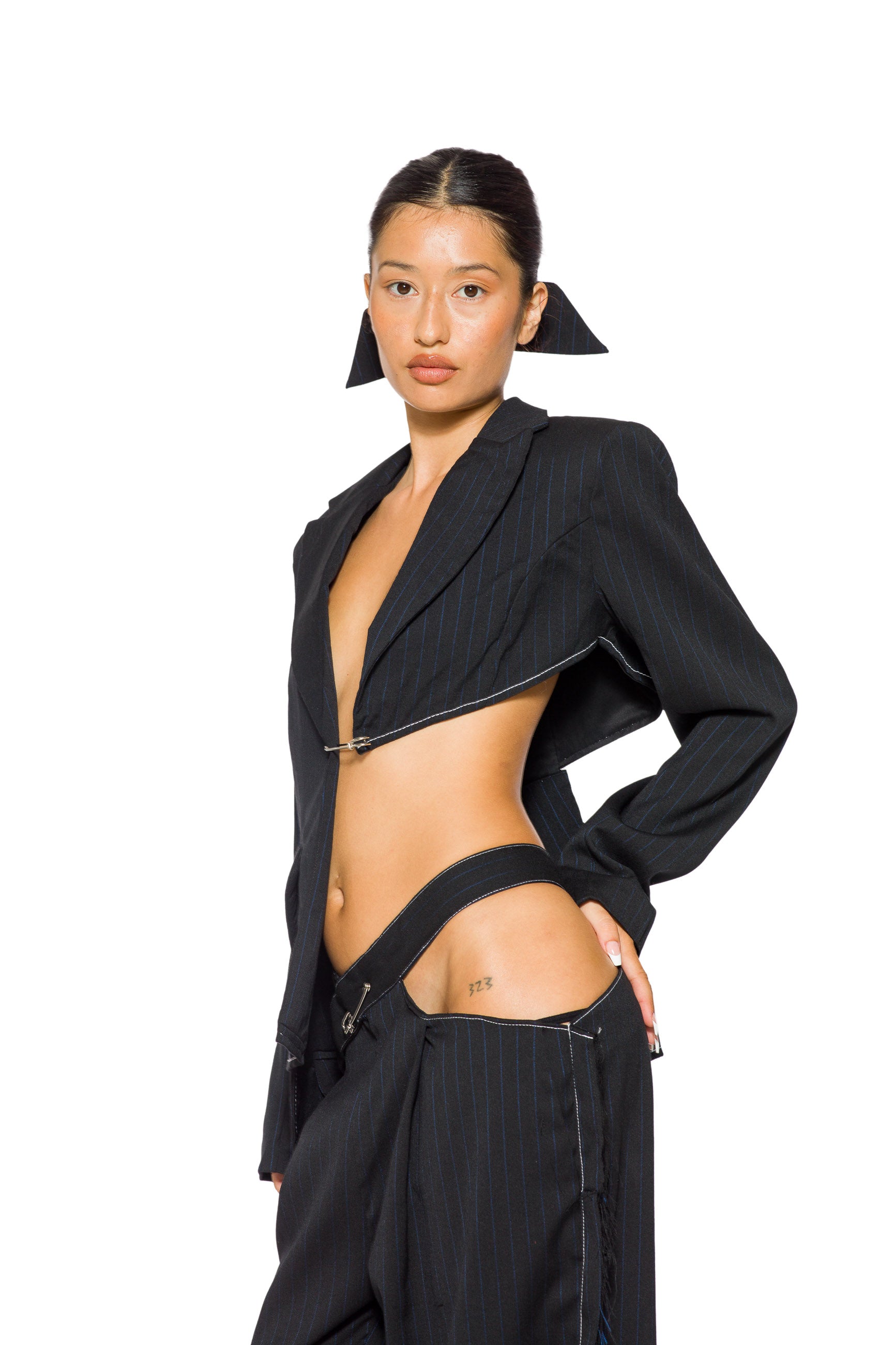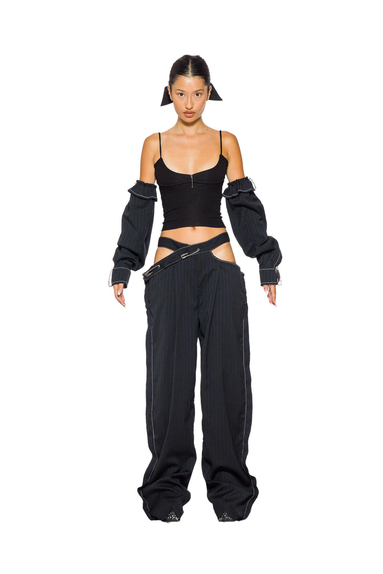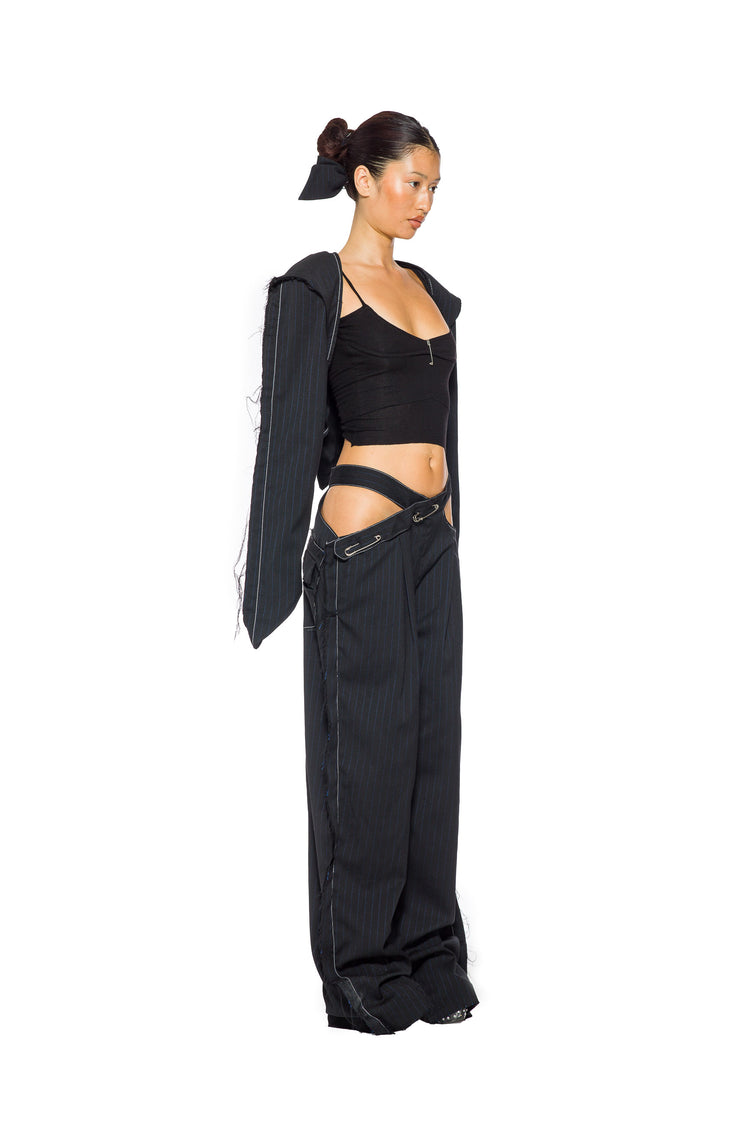CUTOUT TROUSER IN BLACK PIN STRIPE SUITING