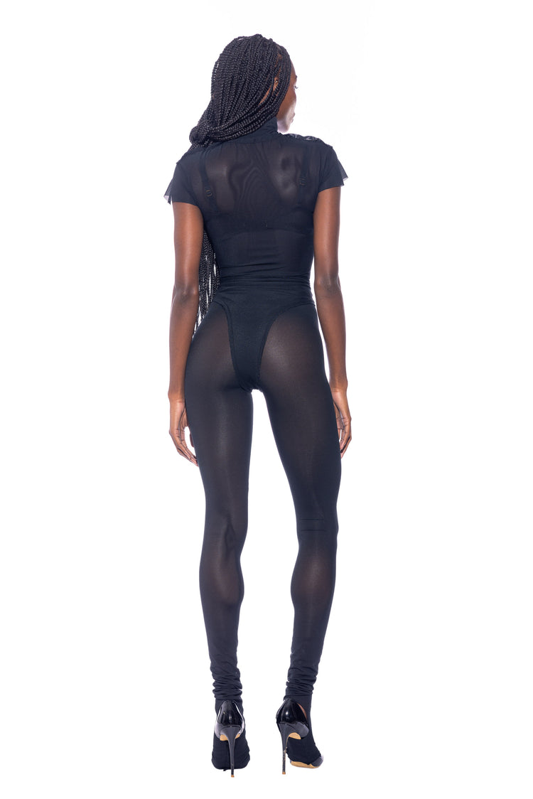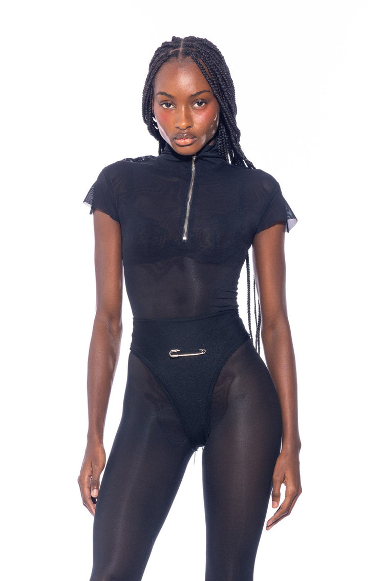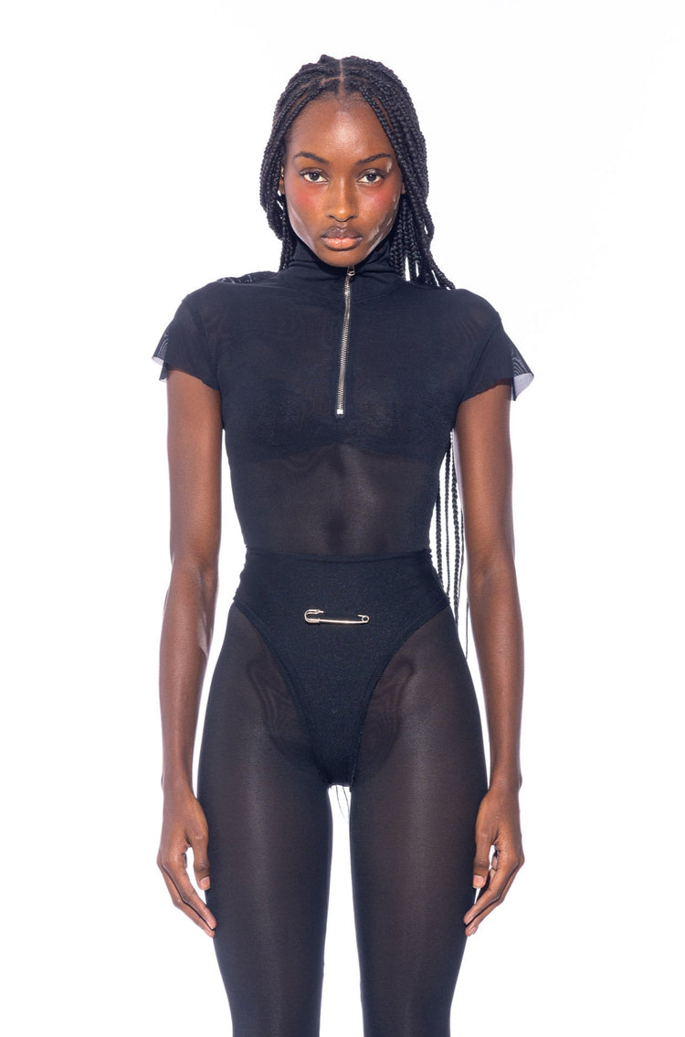 CAP SLEEVE BODYSUIT IN BLACK ECO MESH
