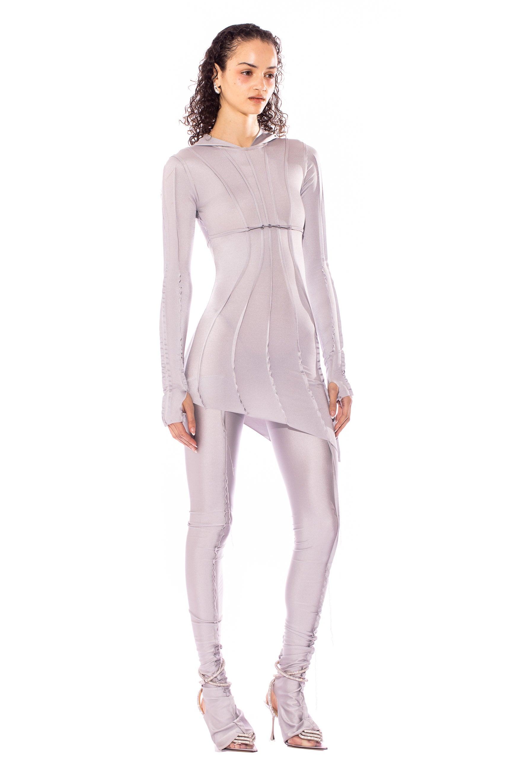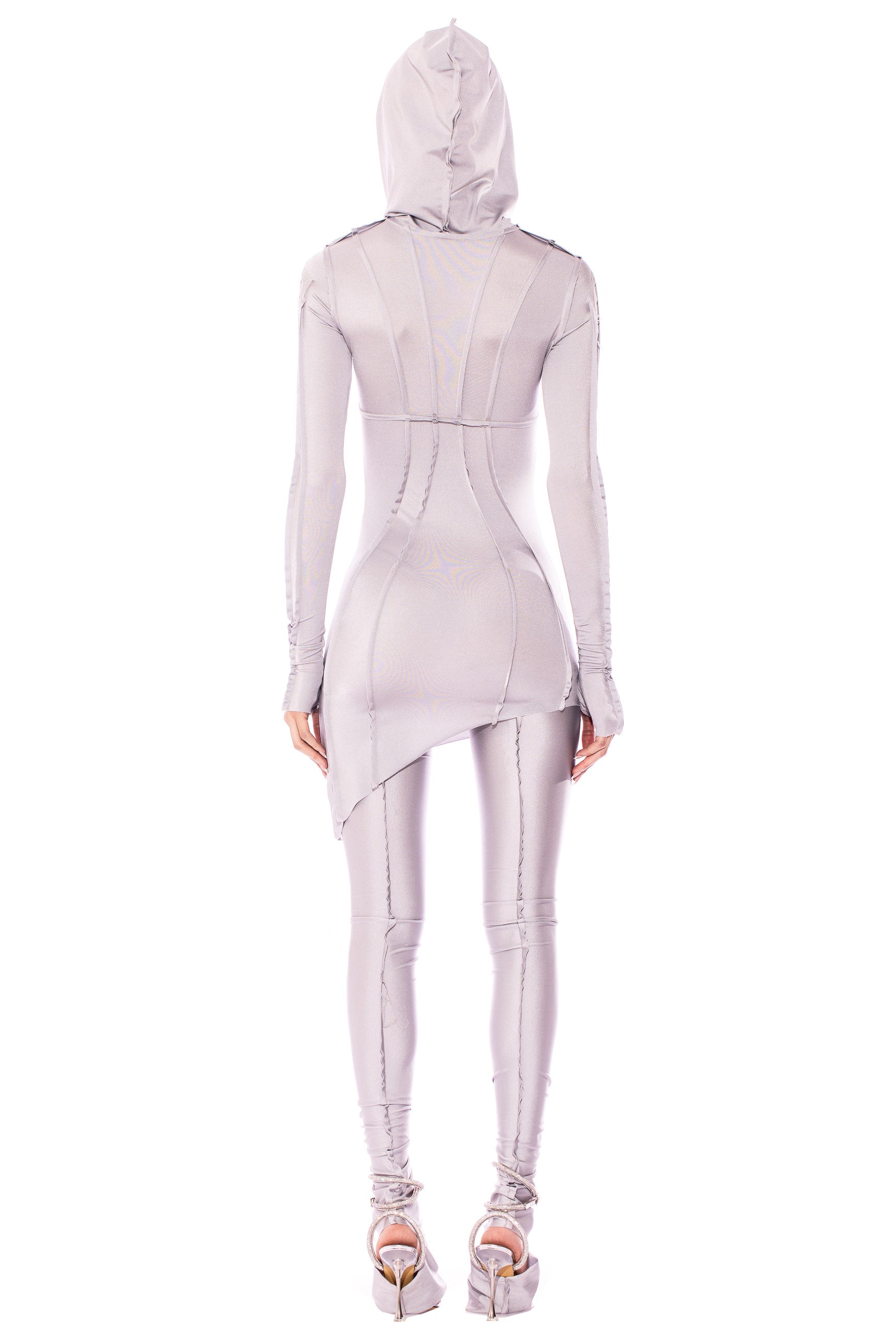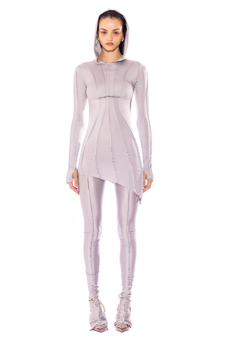 ASYMMETRIC HOODIE DRESS IN SILVER STRETCH