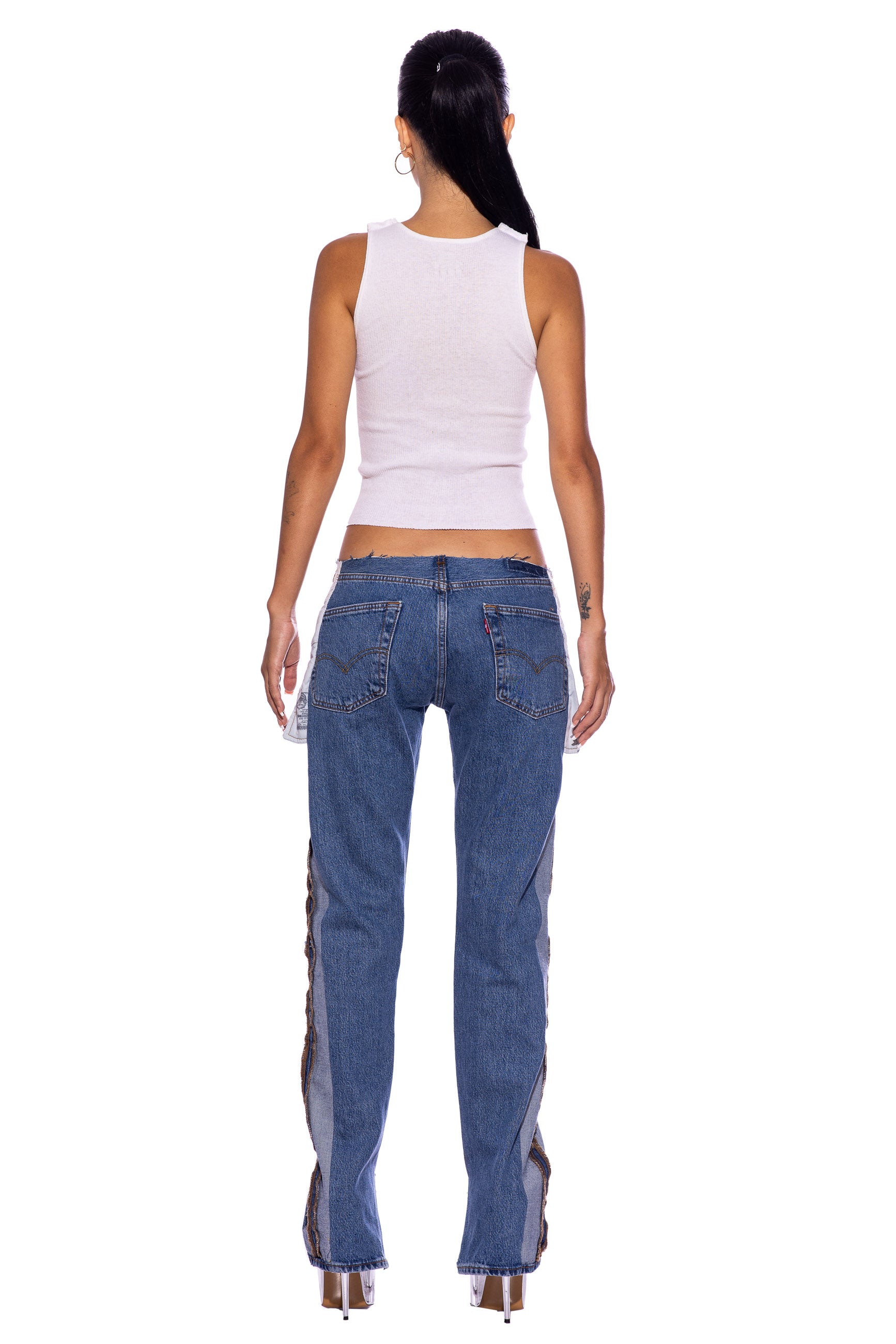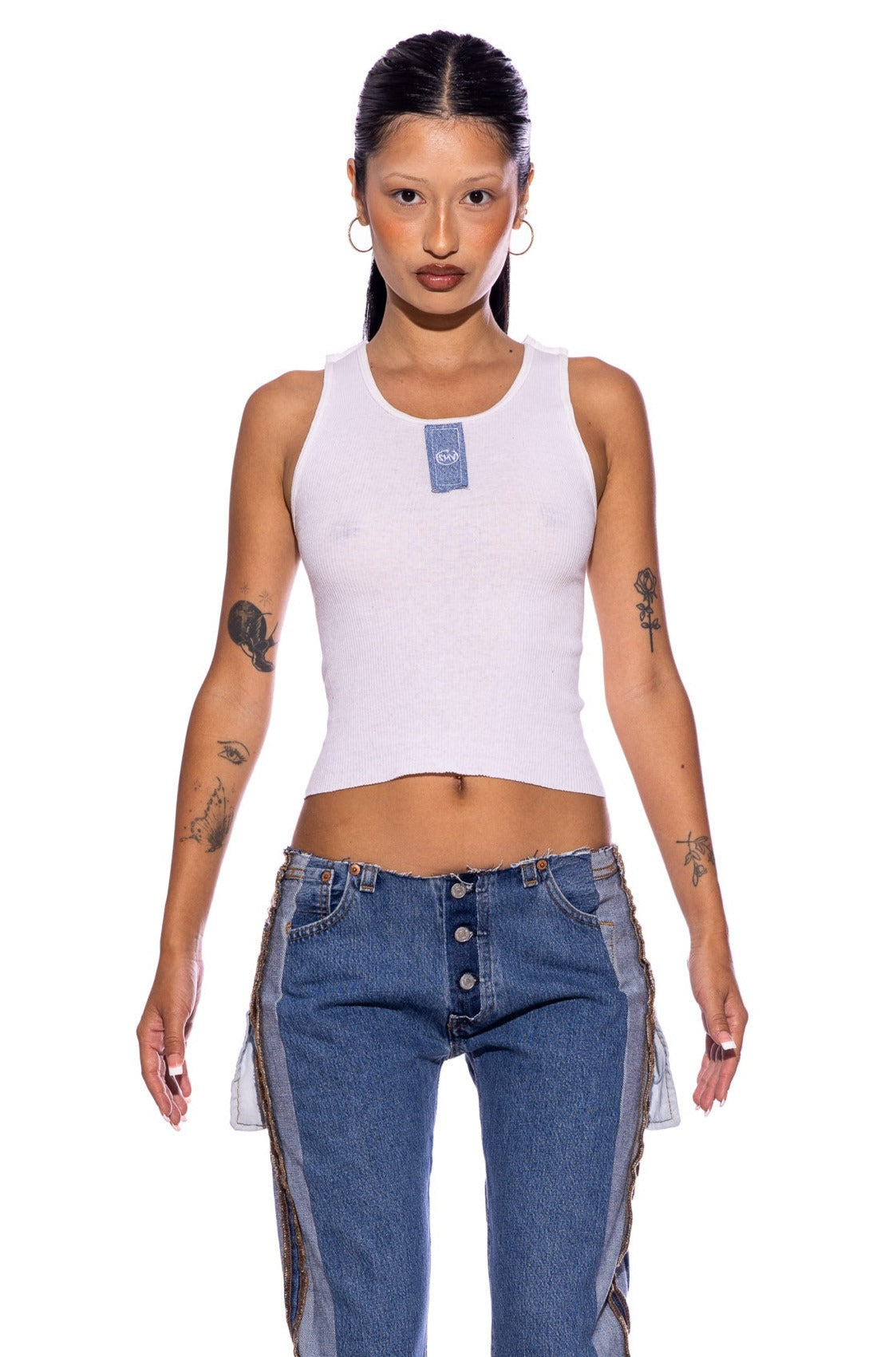 Reworked from vintage white tanks with our signature Open Seam lines and embroidered vintage blue denim scrap.
