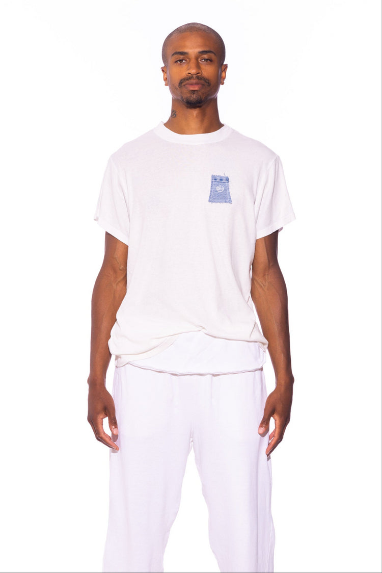 BLUE DENIM SCRAP LOOSE TEE IN WHITE