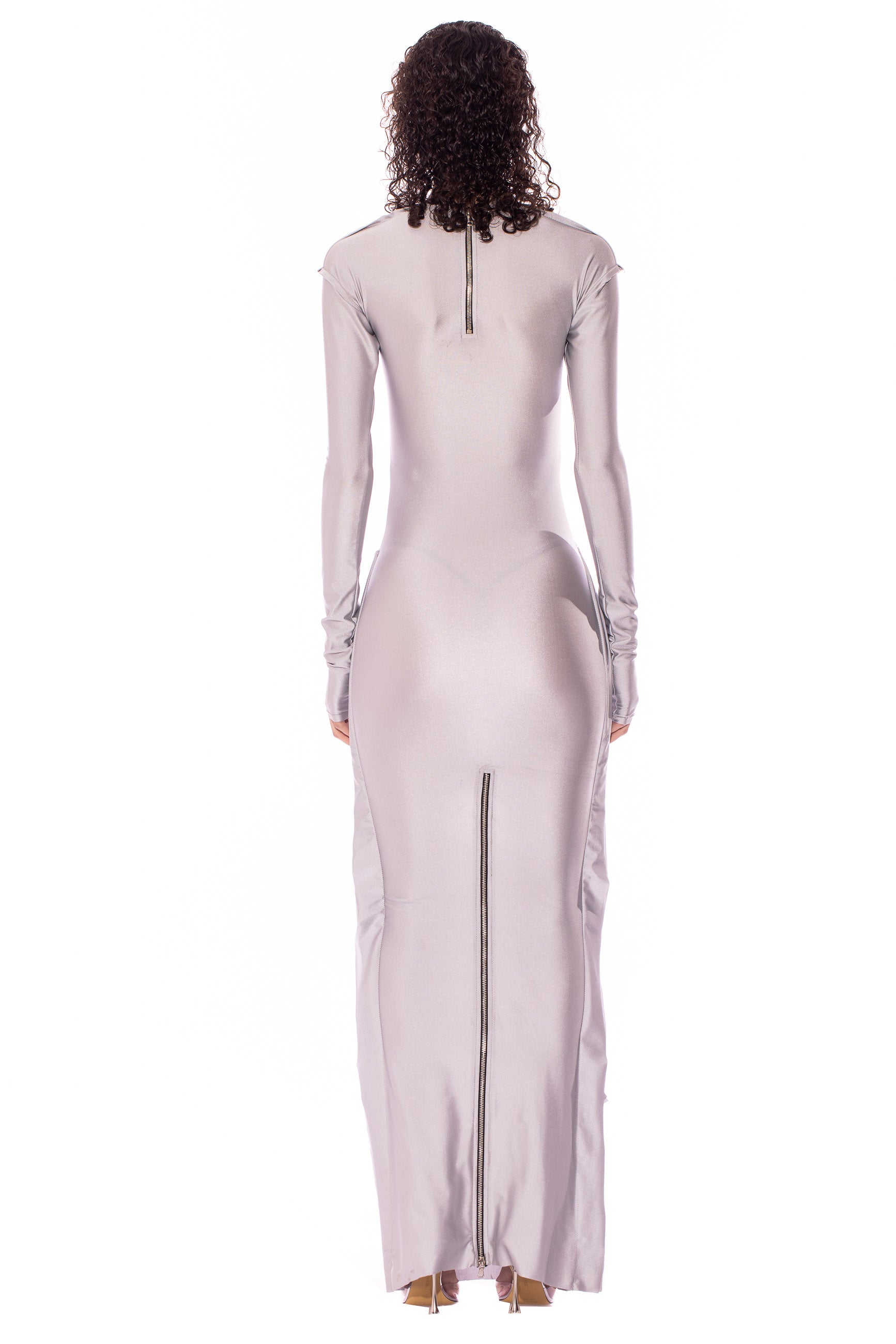 OPEN SEAM MAXI DRESS IN SILVER STRETCH