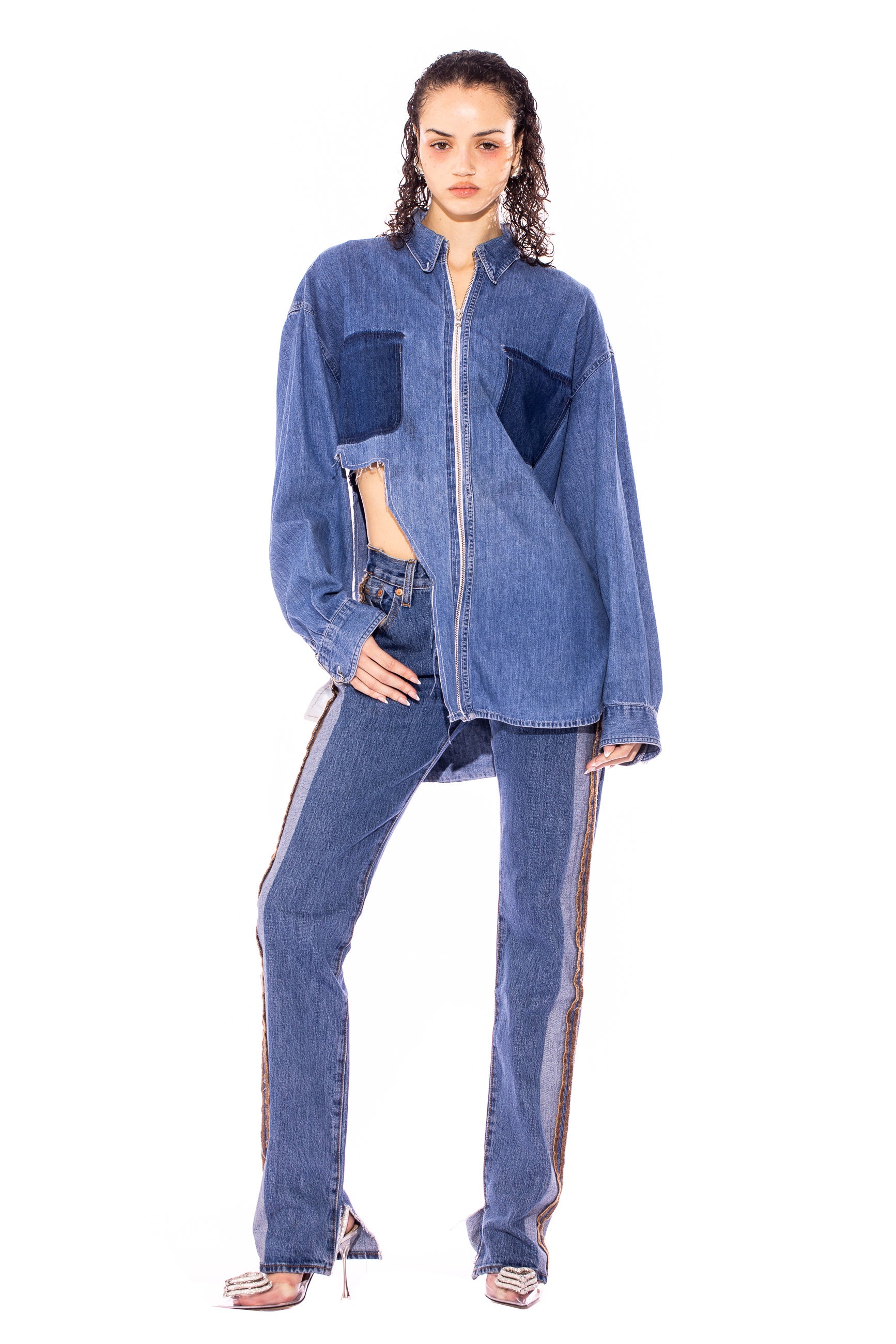 RAW ZIP-UP COLLARED SHIRT IN VINTAGE DENIM