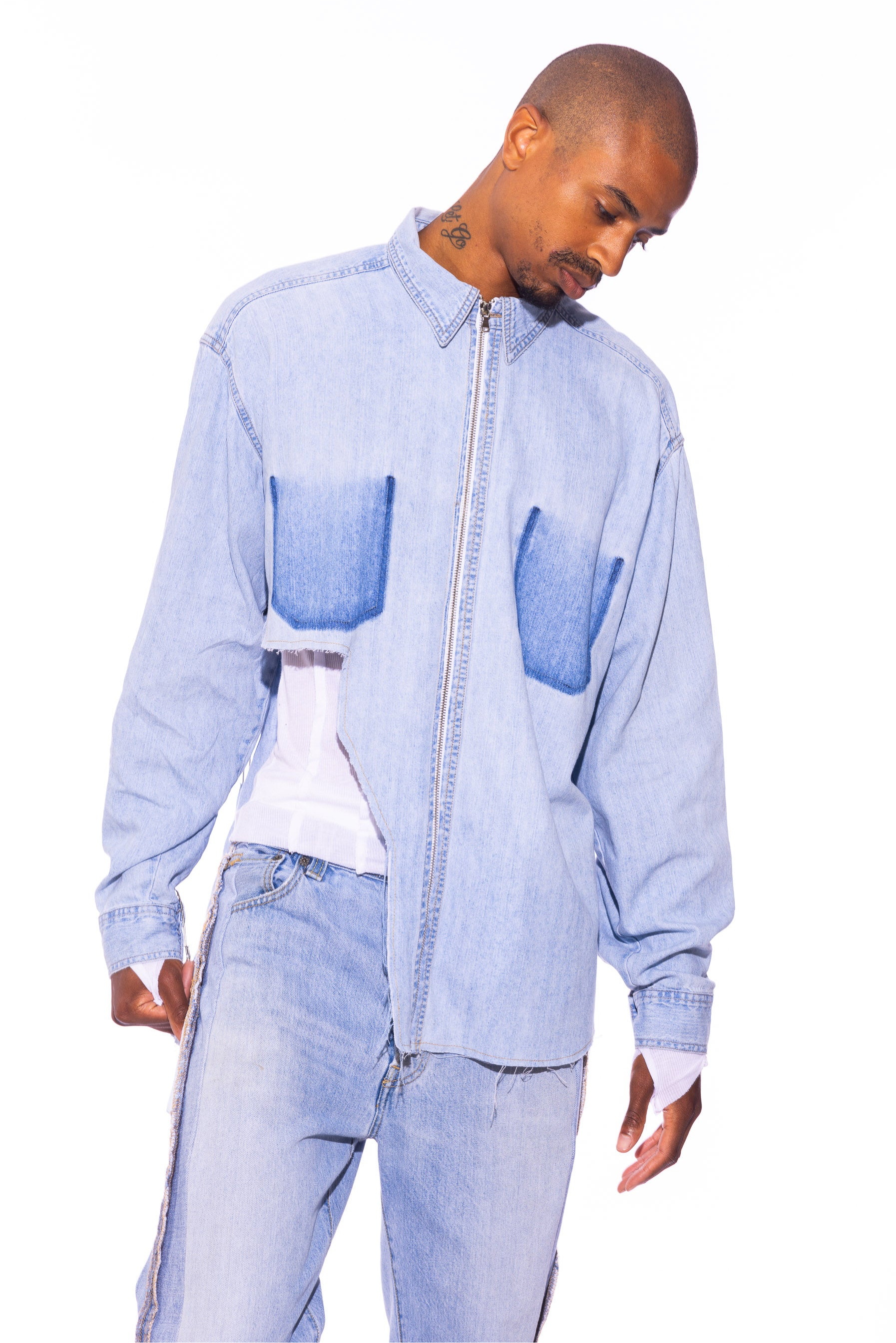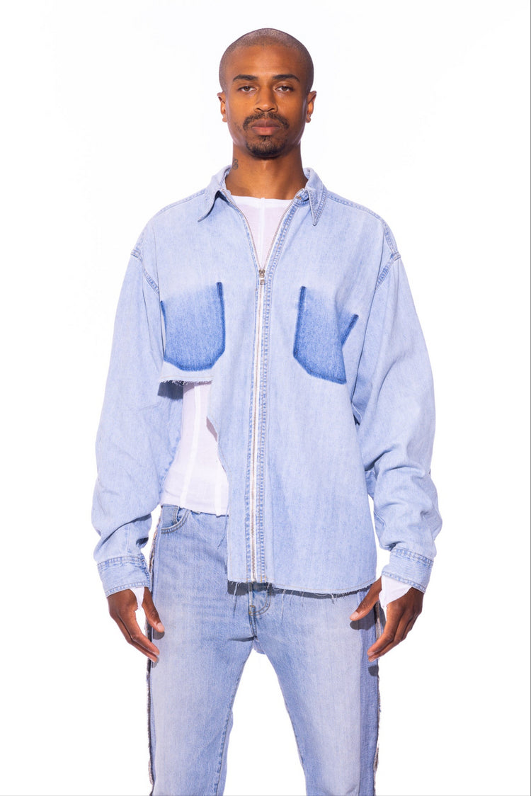 RAW ZIP-UP COLLARED SHIRT IN VINTAGE DENIM