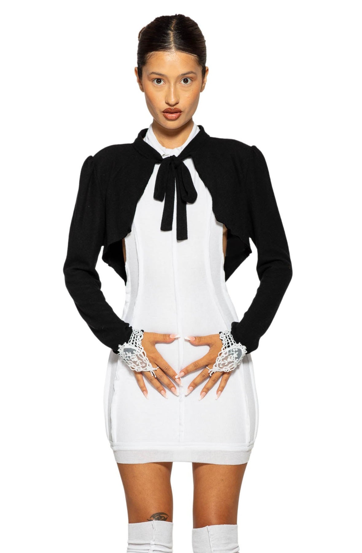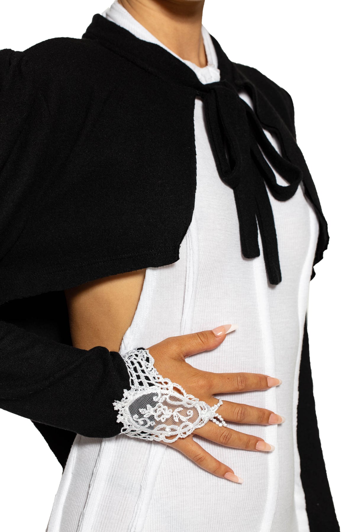 Made from up-cycled black knit with white Victorian lace cuffs and a middle finger elastic.