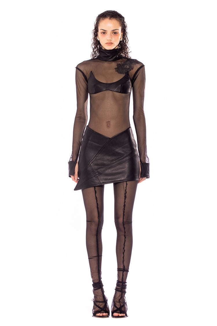 Pair it with The Bodysuit in Black Leather and our Open Seam Leg Warmers in Black Mesh.