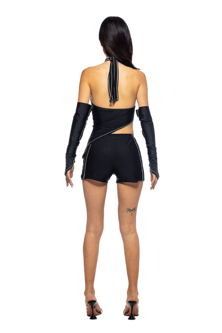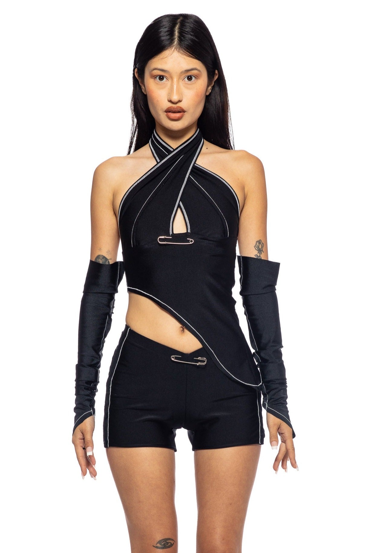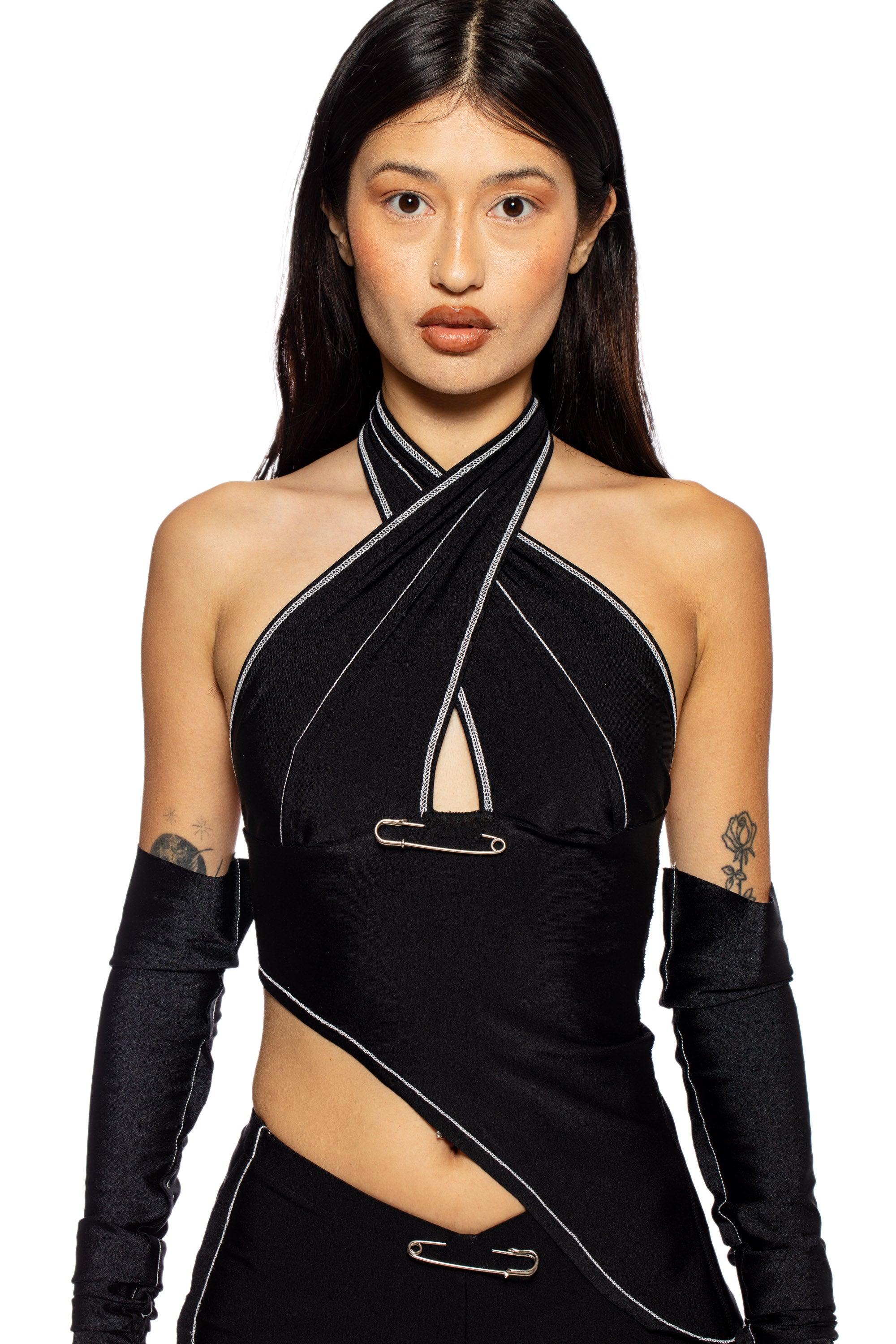 ASYMMETRIC CROSS NECK HALTER IN BLACK STRETCH