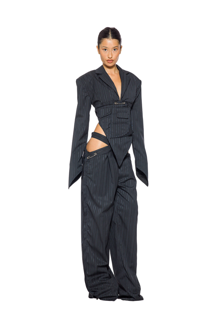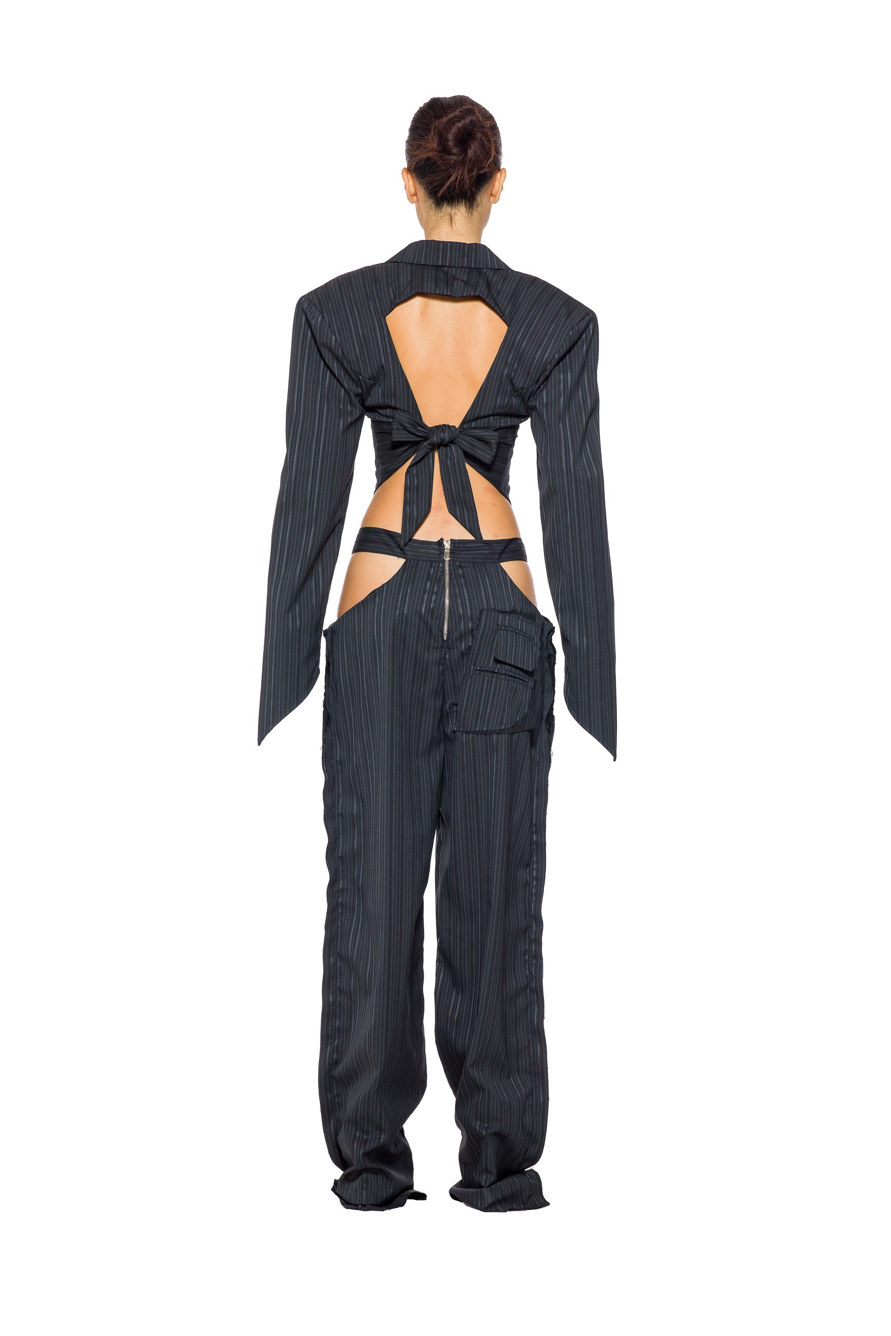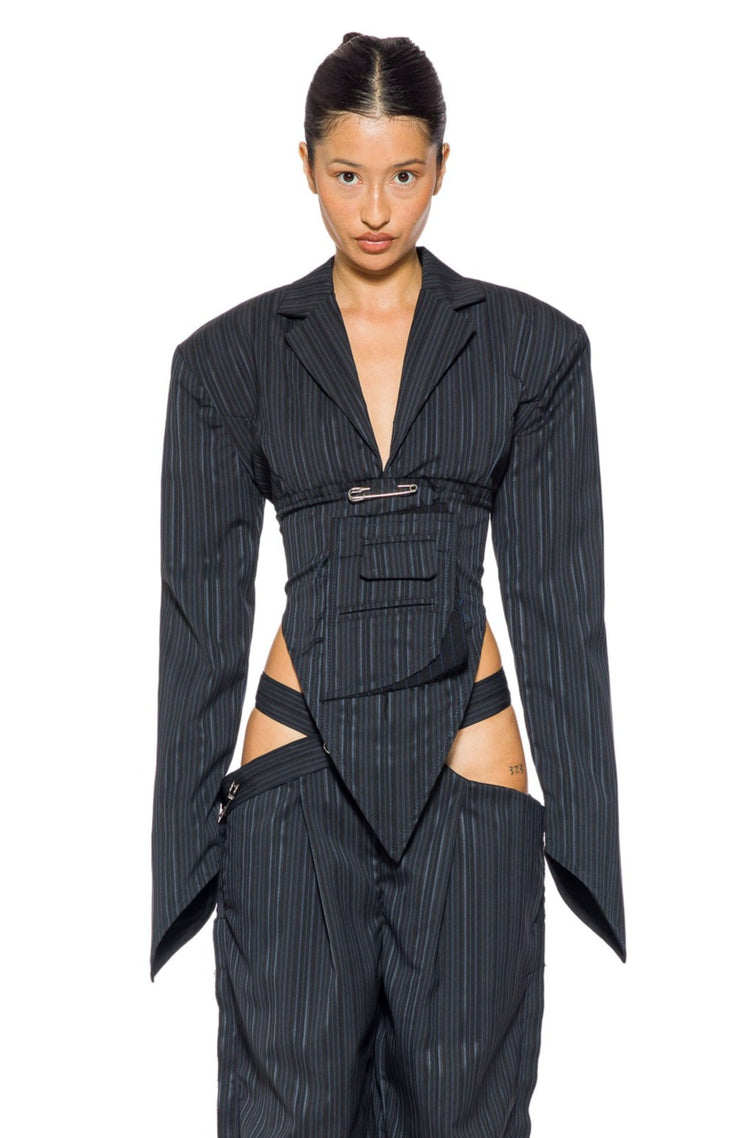 V CUT OPEN BACK BLAZER IN BLUE MULTI STRIPE SUITING