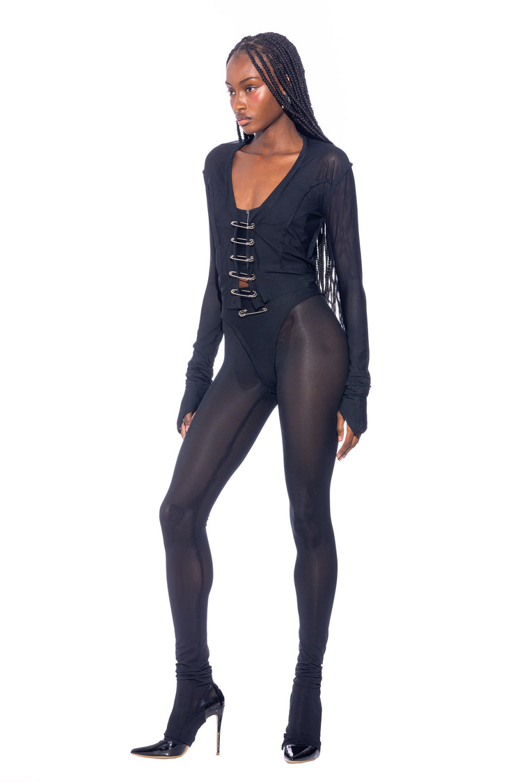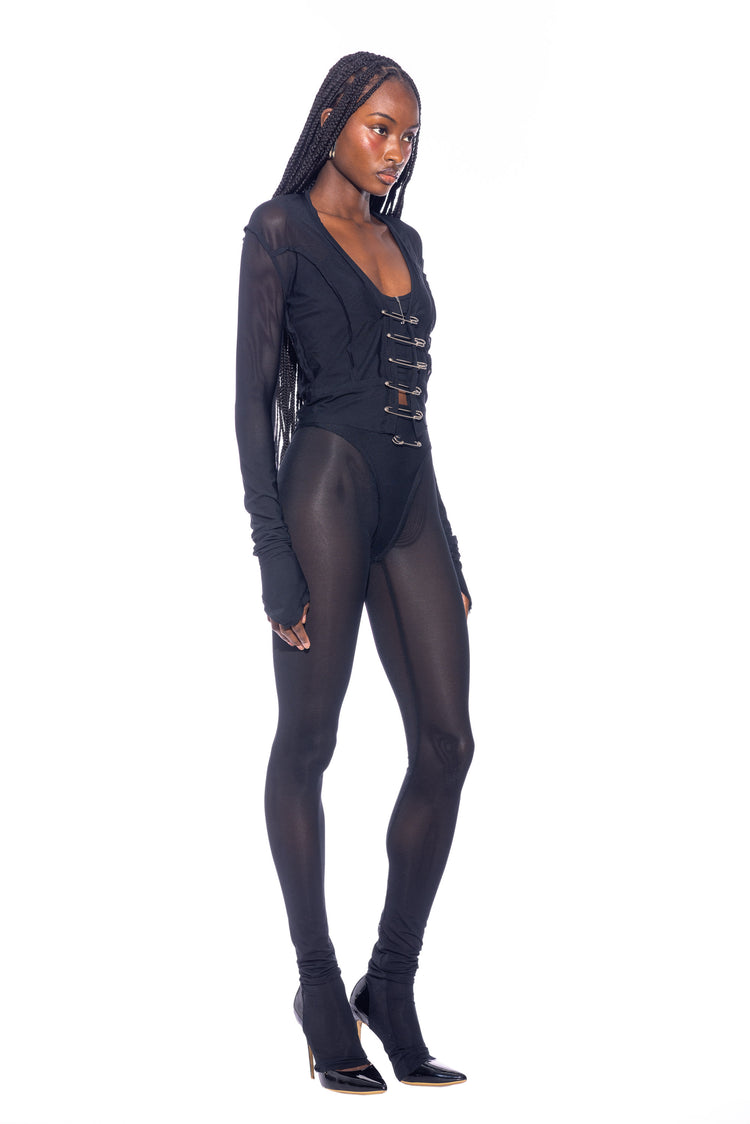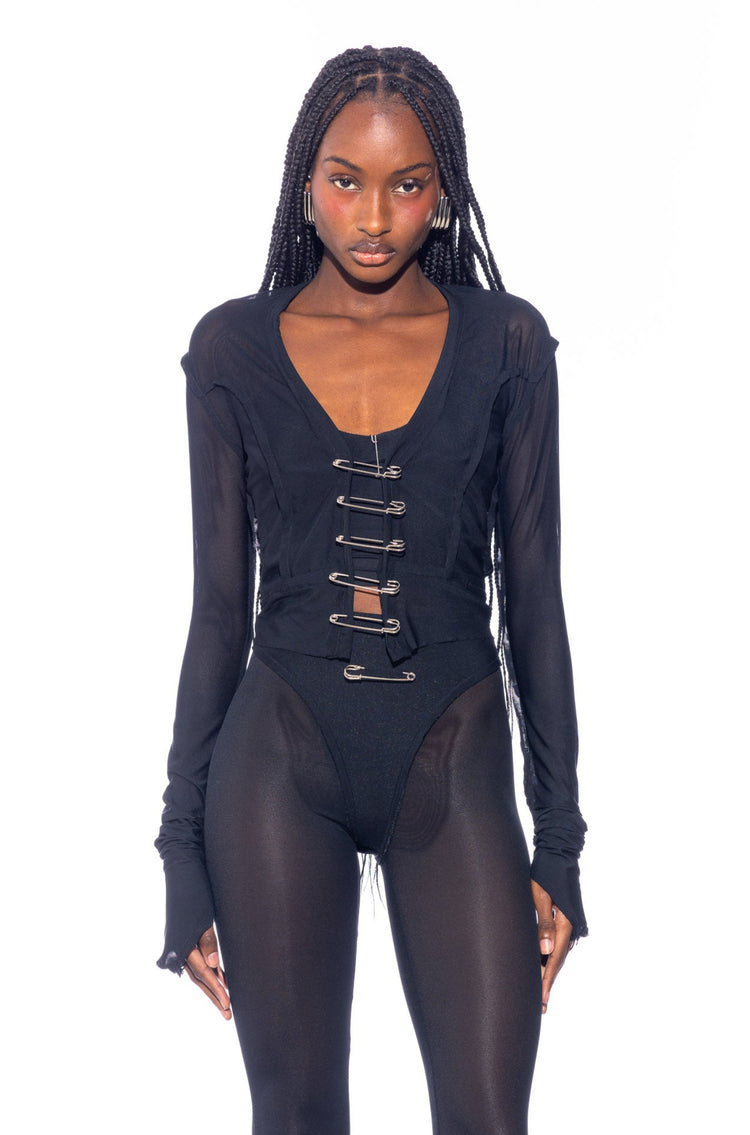 SAFETY PIN CARDIGAN IN BLACK ECO MESH