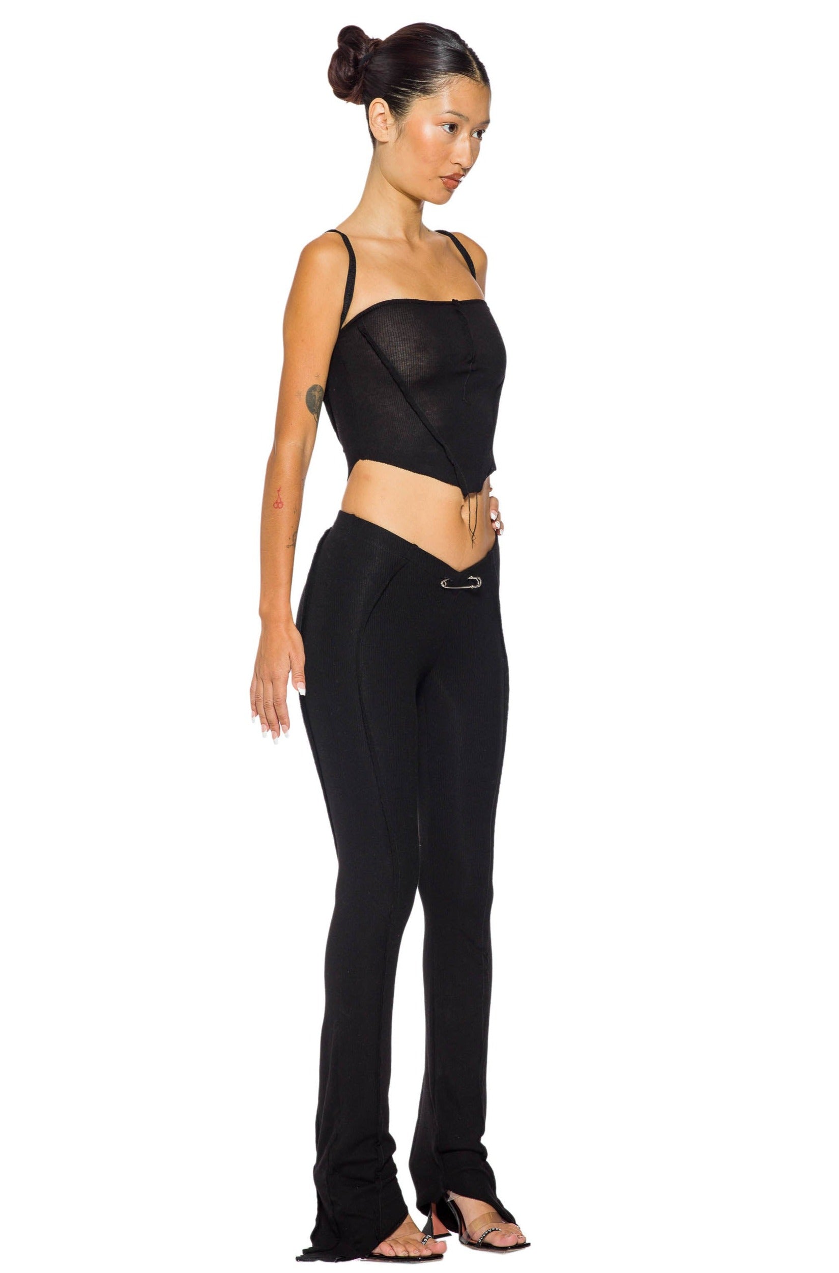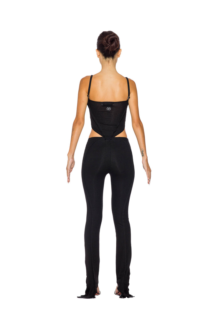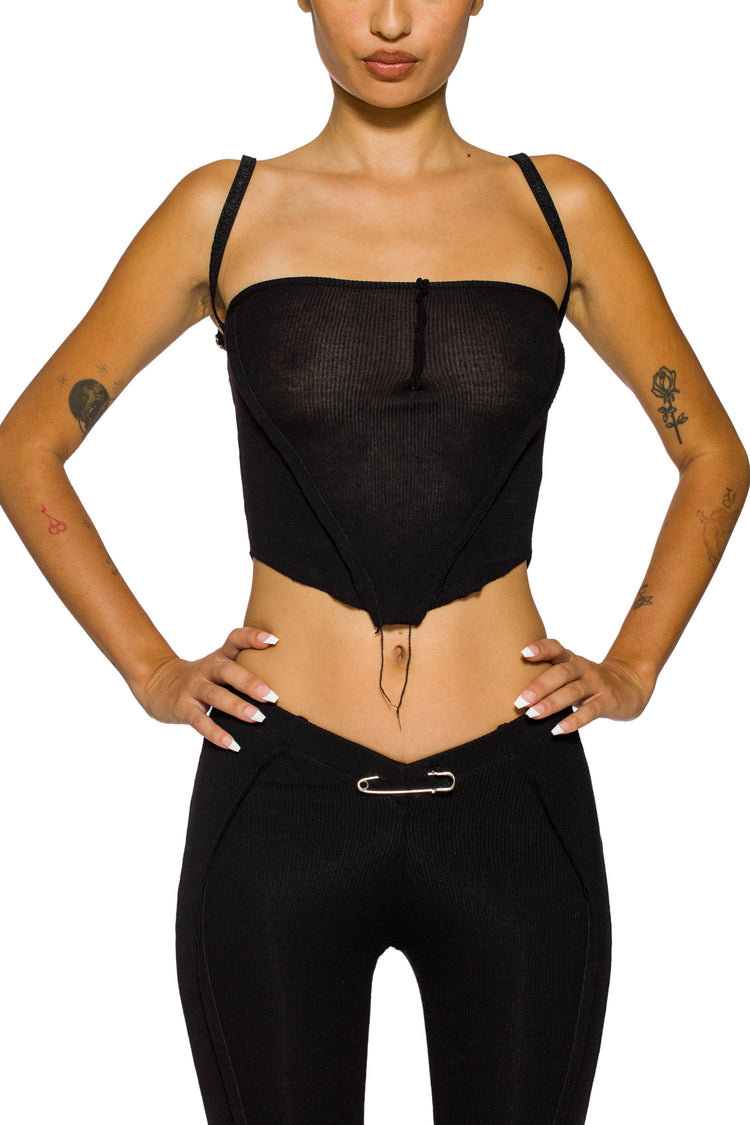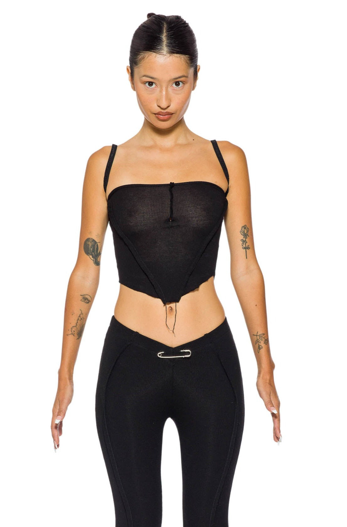 Victorian style straps add an elegant and feminine contrast to the raw finish of the bodice.