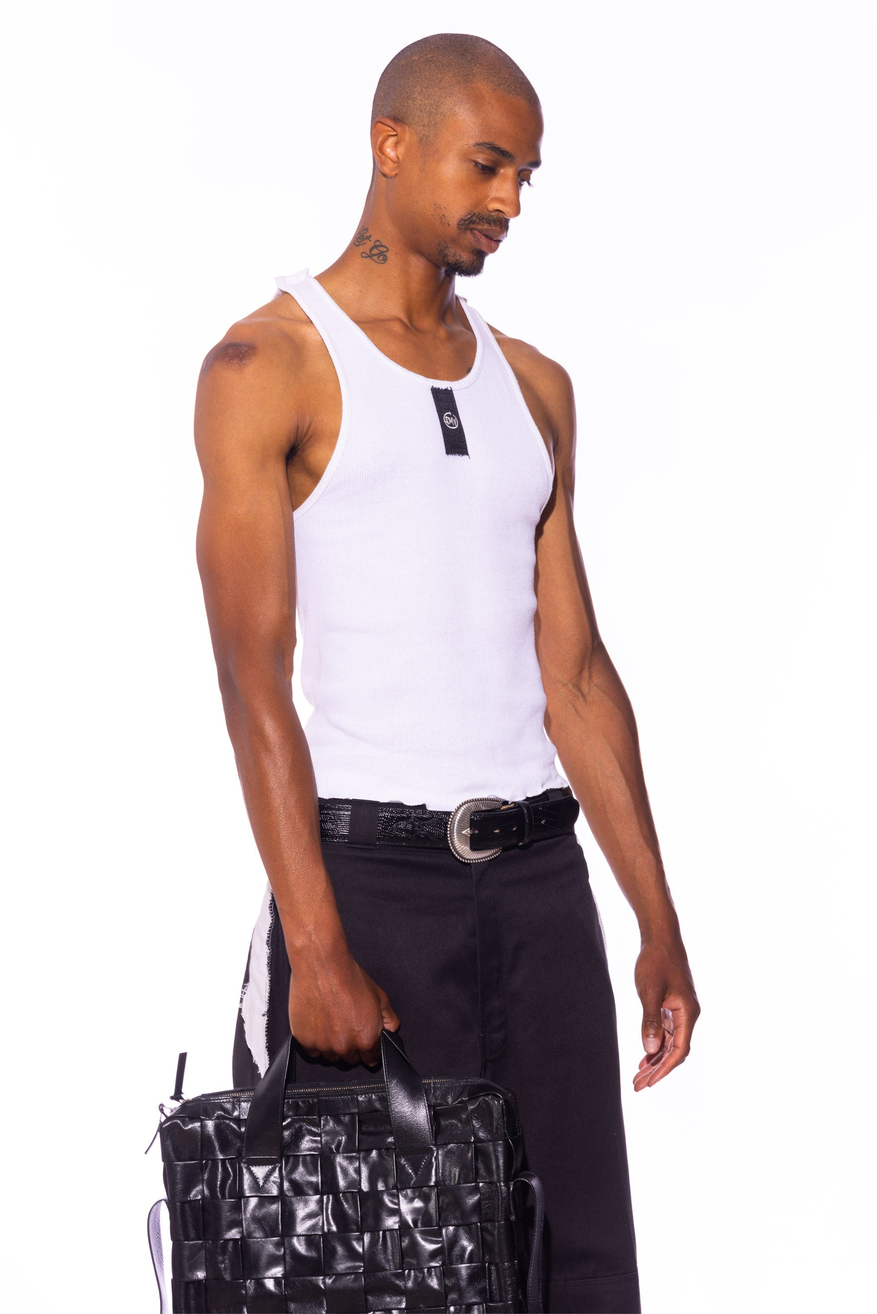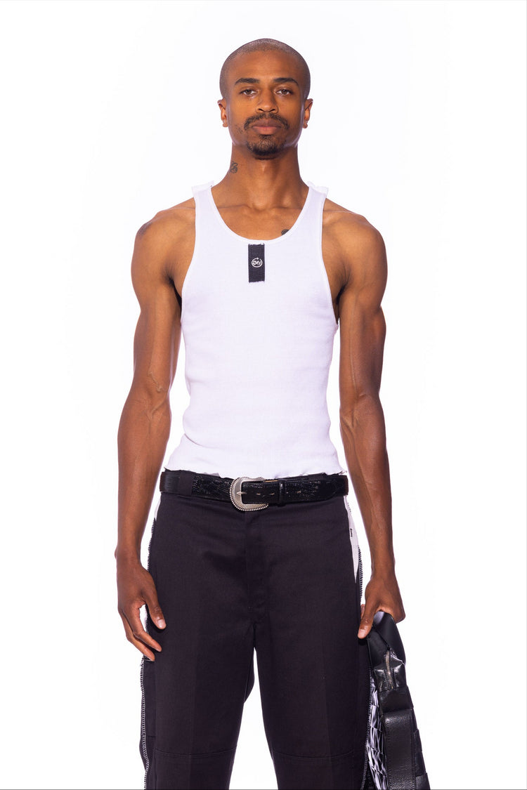 BLACK DENIM SCRAP TANK IN WHITE