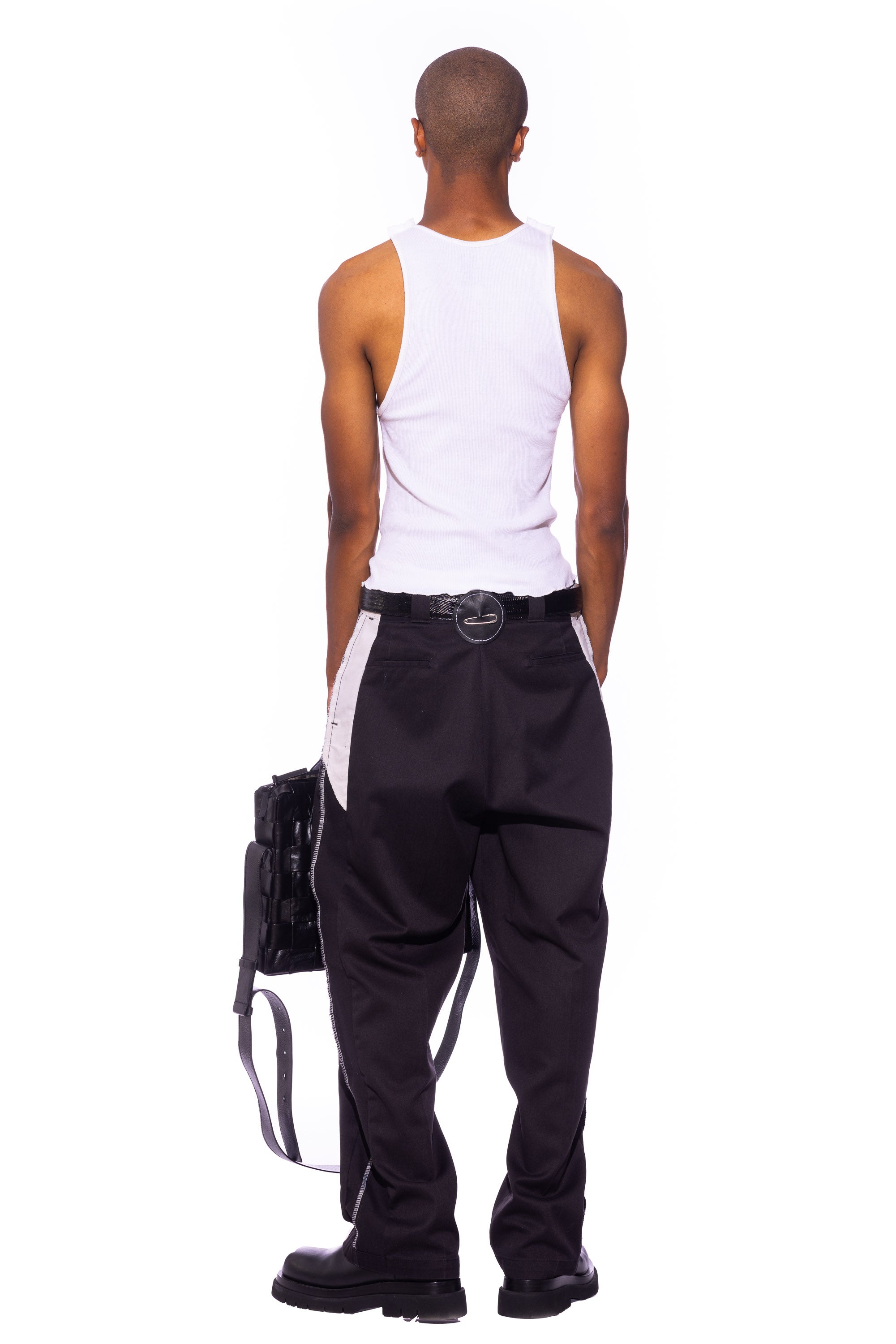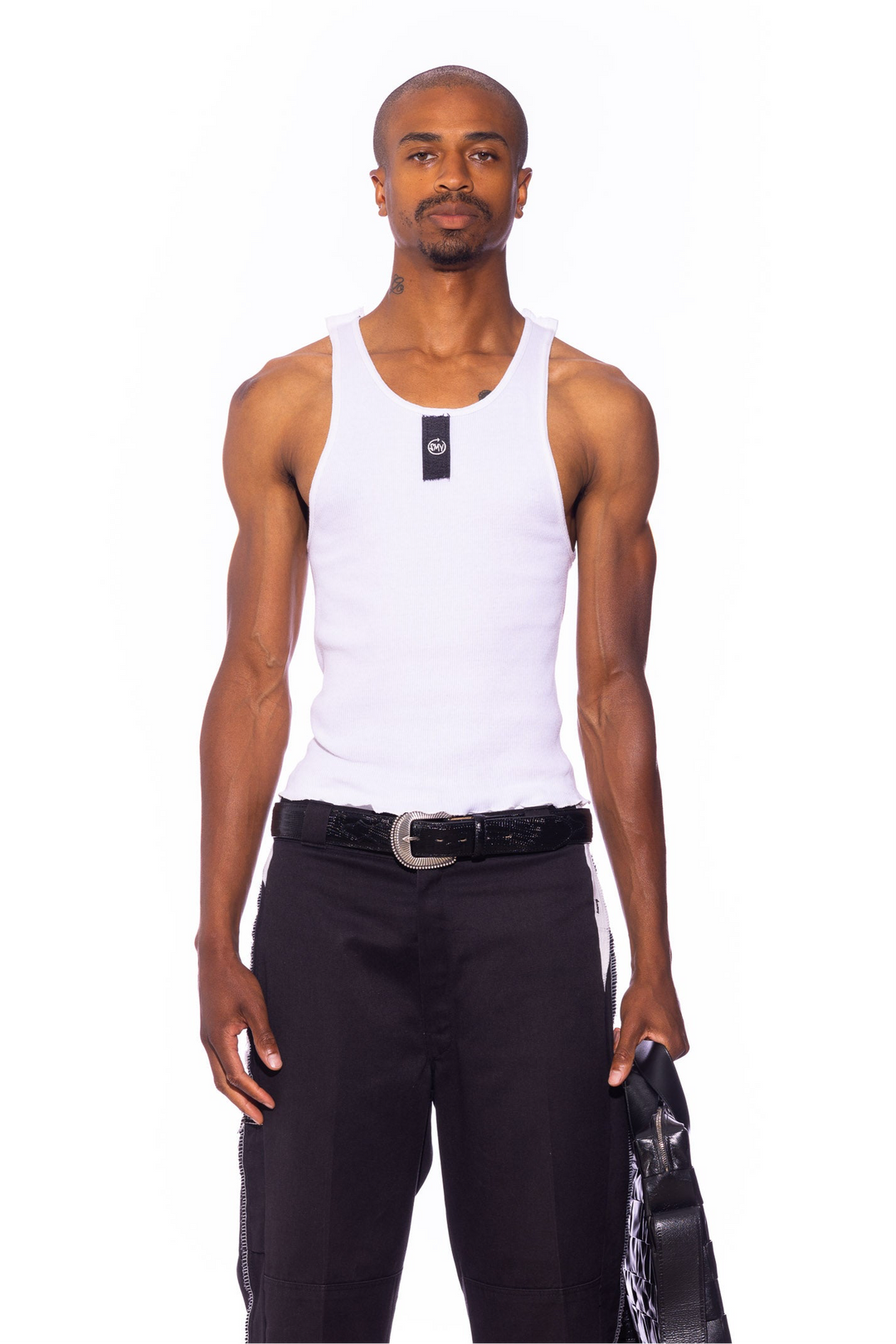Reworked from vintage white rib tanks with our signature Open Seam lines and embroidered vintage black denim scrap.
