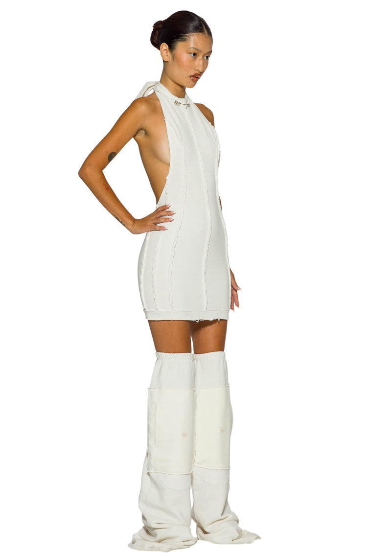 OPEN SEAM LOW BACK HALTER DRESS IN WHITE TERRY