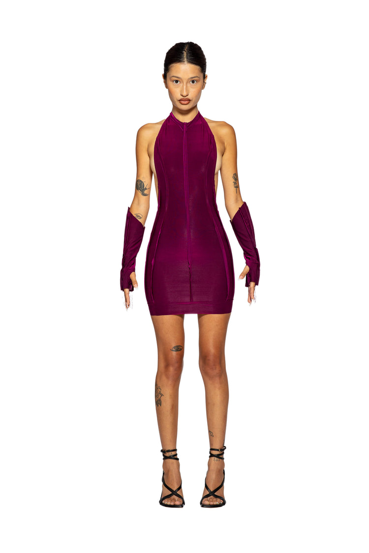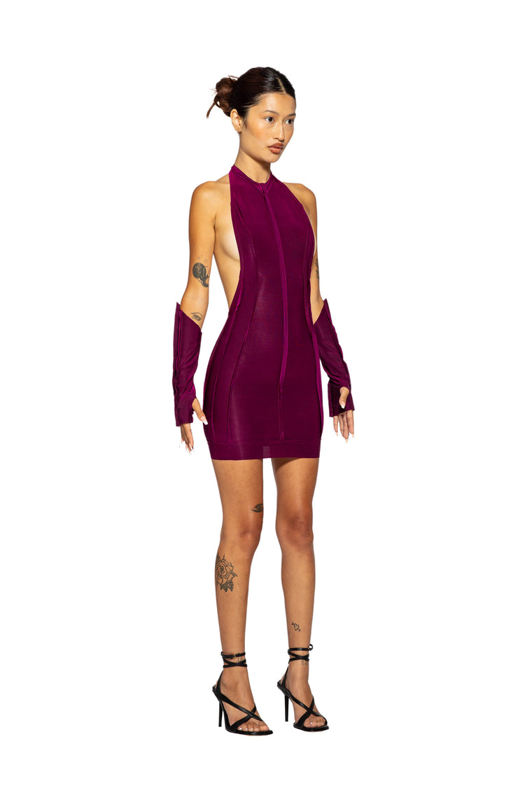 OPEN SEAM LOW BACK HALTER DRESS IN IRIDESCENT ORCHID
